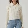 The Esma Sweater features a V neckline that leads to a fitted bodice with directional patterns along the front. Long sleeves with puff shoulders.