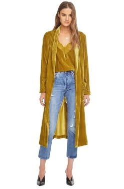 82% Viscose/18% Modal, Length: 47 7/8″ (Size M), Self Tie Closure, Dry Clean Only, Long Belted Jacket, Gold Velvet, Model is Wearing Size S, Model’s Measurements: Height 5’10” // Bust 34″ // Waist 24″ // Hips 34″, Fits True to Size, Style#ACT15139