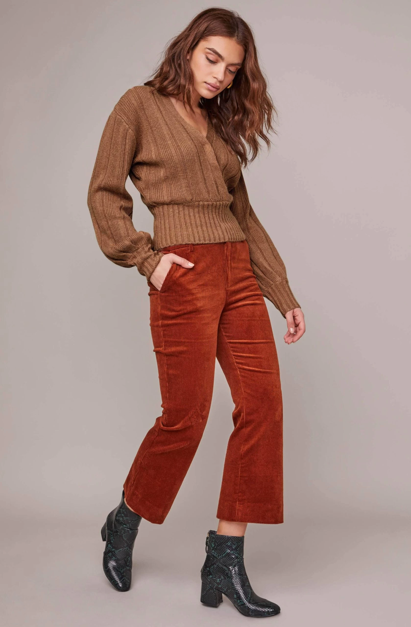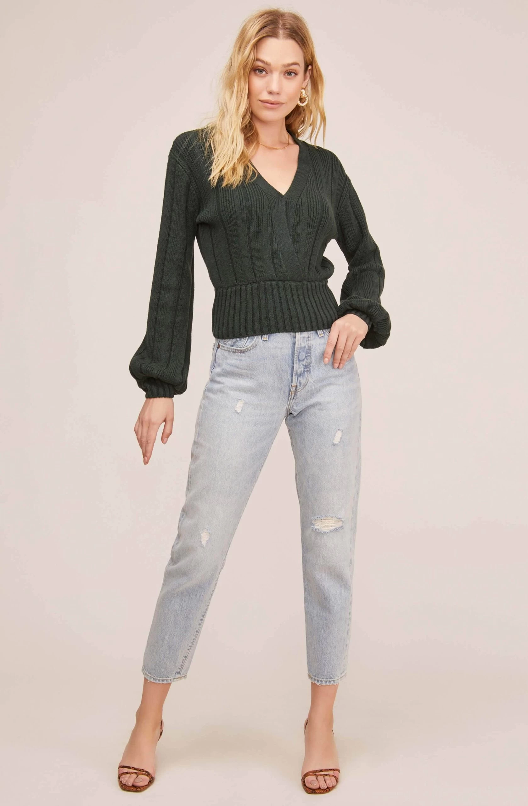Fall knits bring cozy vibes. This luxe sweater features a V neckline that descends to a wrap front. Ribbed design accentuates this style’s soft texture. Long sleeves.