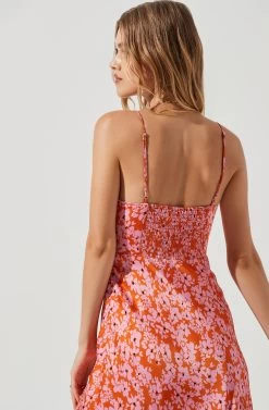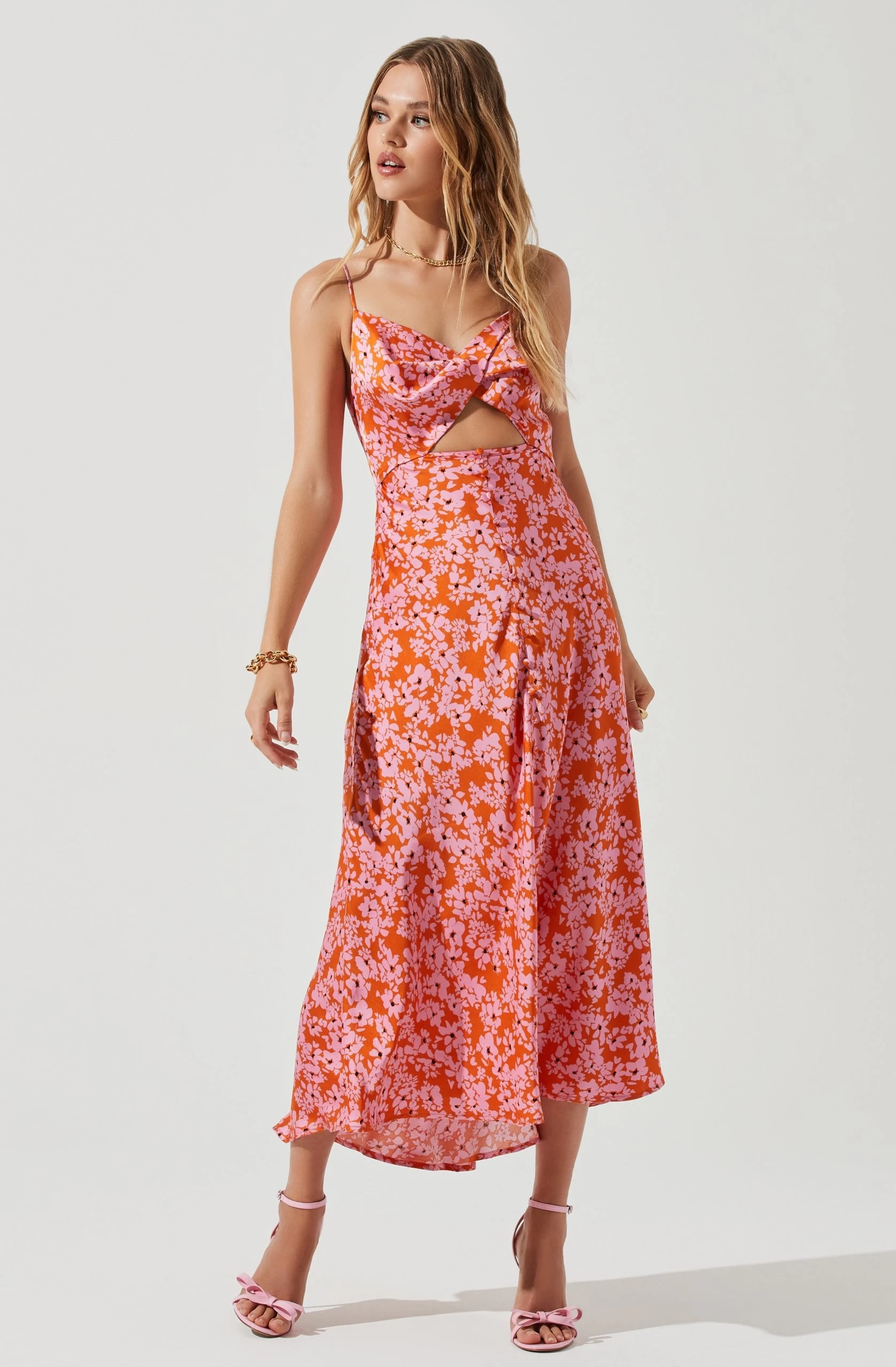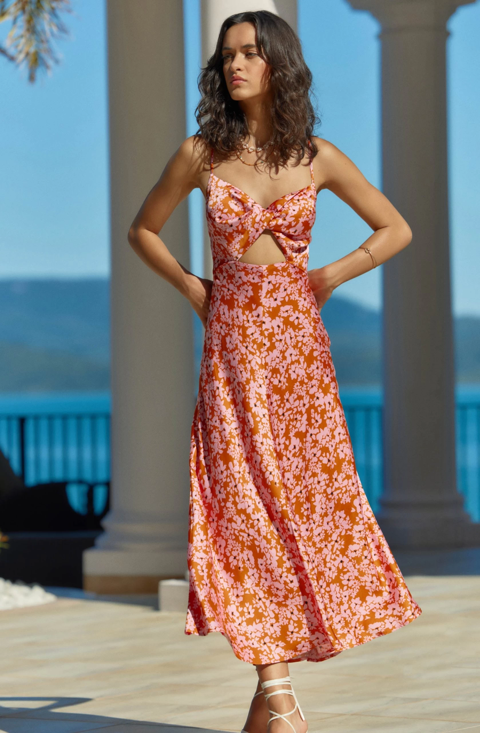 The Farida Dress features an allover vibrant floral print. V neckline leads to a twist front detail and cutout accent. Midi length skirt. Smocked back. Adjustable straps.