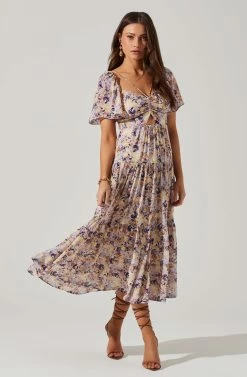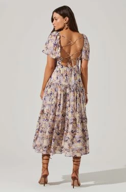 This floral dress features a halter neck that leads to a cinched bust with a statement cutout accent. Tiered midi dress. Short puff sleeves. Open back with cross straps.