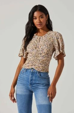 This floral print top features a round neckline that leads to a keyhole front and single hook-and-eye closure. Ruched bodice with a concealed side zip closure. Short flutter sleeves.
