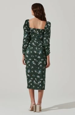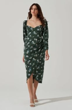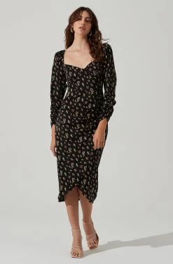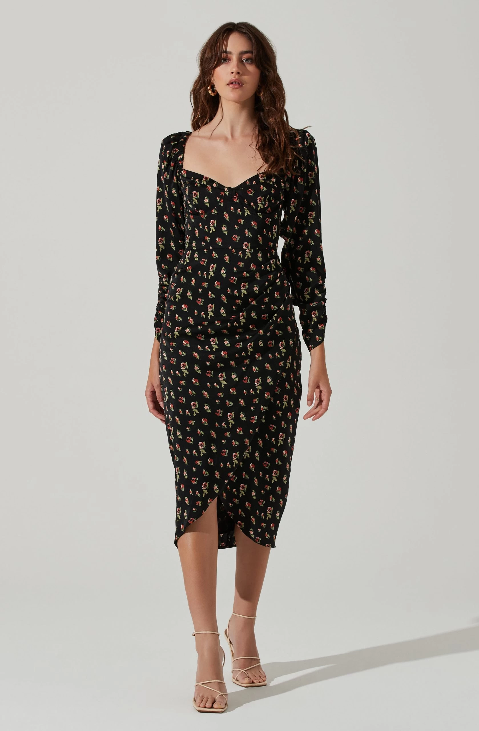 This floral midi dress features a sweetheart neckline with a cupped bust. Long ruched sleeves. Ruched detailing at the bodice leads to a wrapped skirt. Concealed back zip closure.