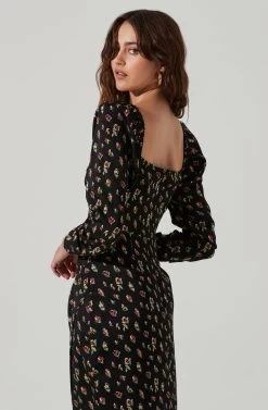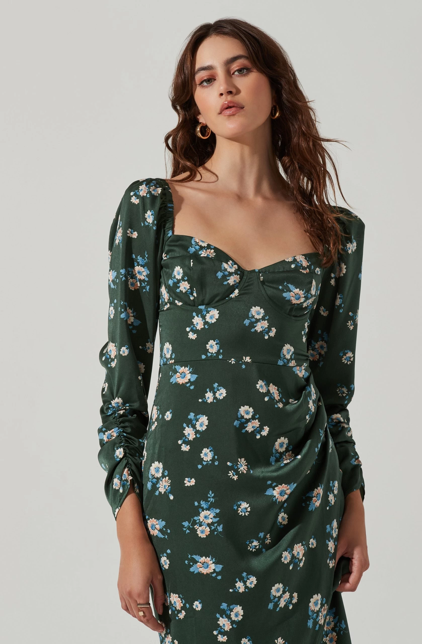 Floral Long Sleeve Milkmaid Satin Midi Dress