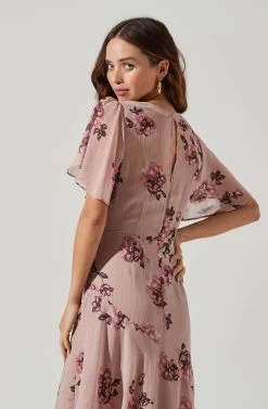 This midi dress features a vintage-inspired floral print. Round neckline leads to pleat details. Defined waist leads to an asymmetrical handkerchief hem. Short flutter sleeves. Keyhole back.