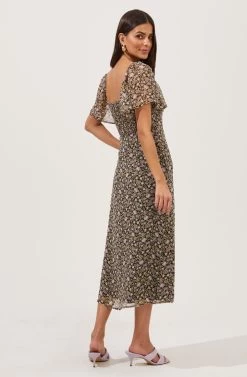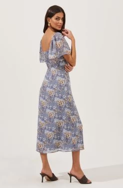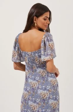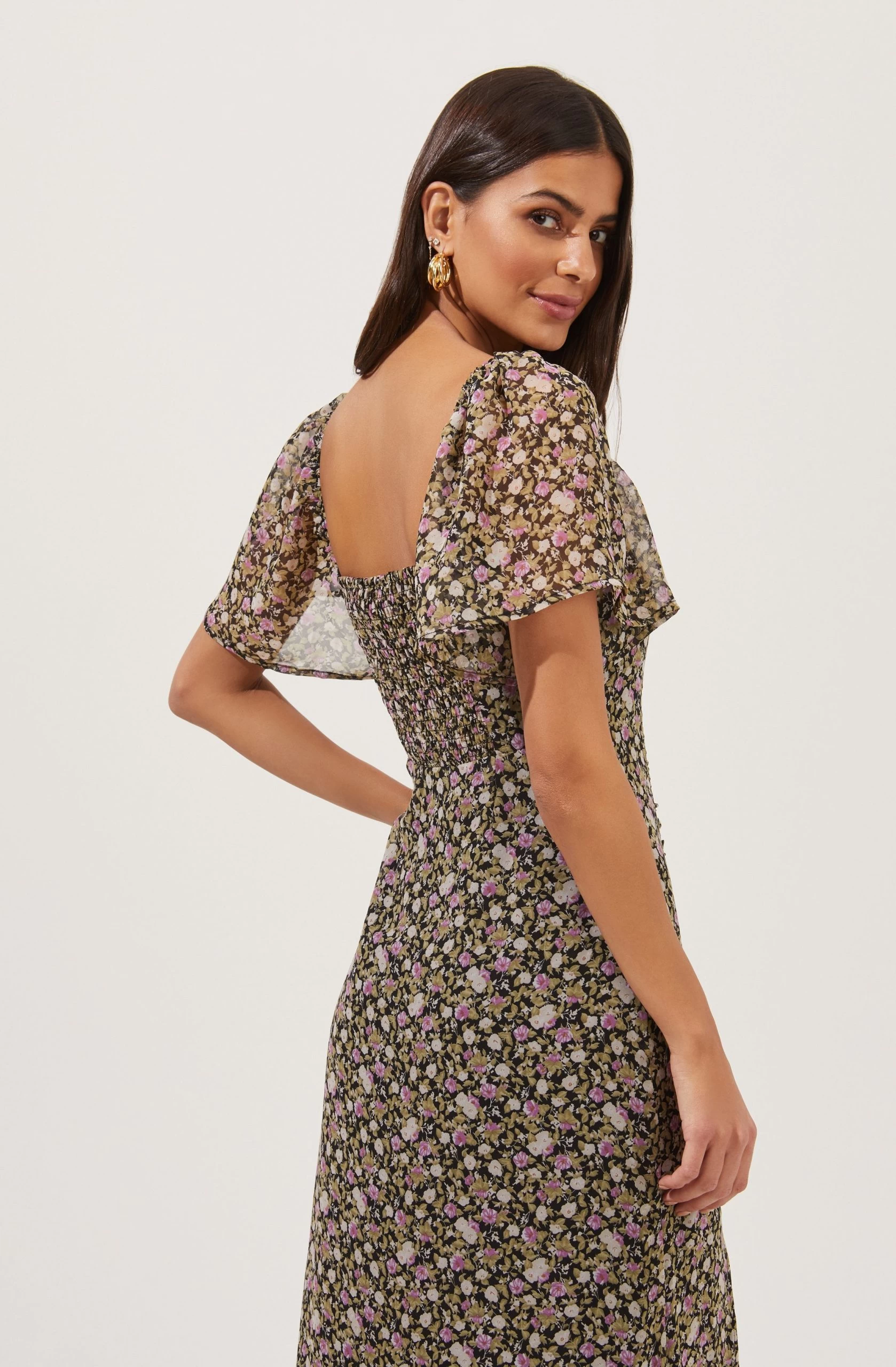 This romantic midi features a square neckline that leads to a ruched bodice and figure-flattering silhouette. Side slit accent on the skirt. Short and sheer flutter sleeves. Smocked back.