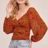 This statement top features halter neck straps. Off-shoulder neckline leads to a tiered ruffle bodice. Short sleeves.