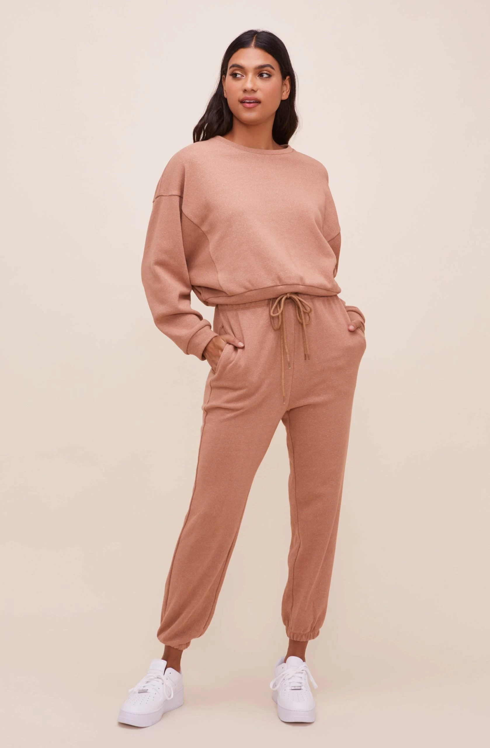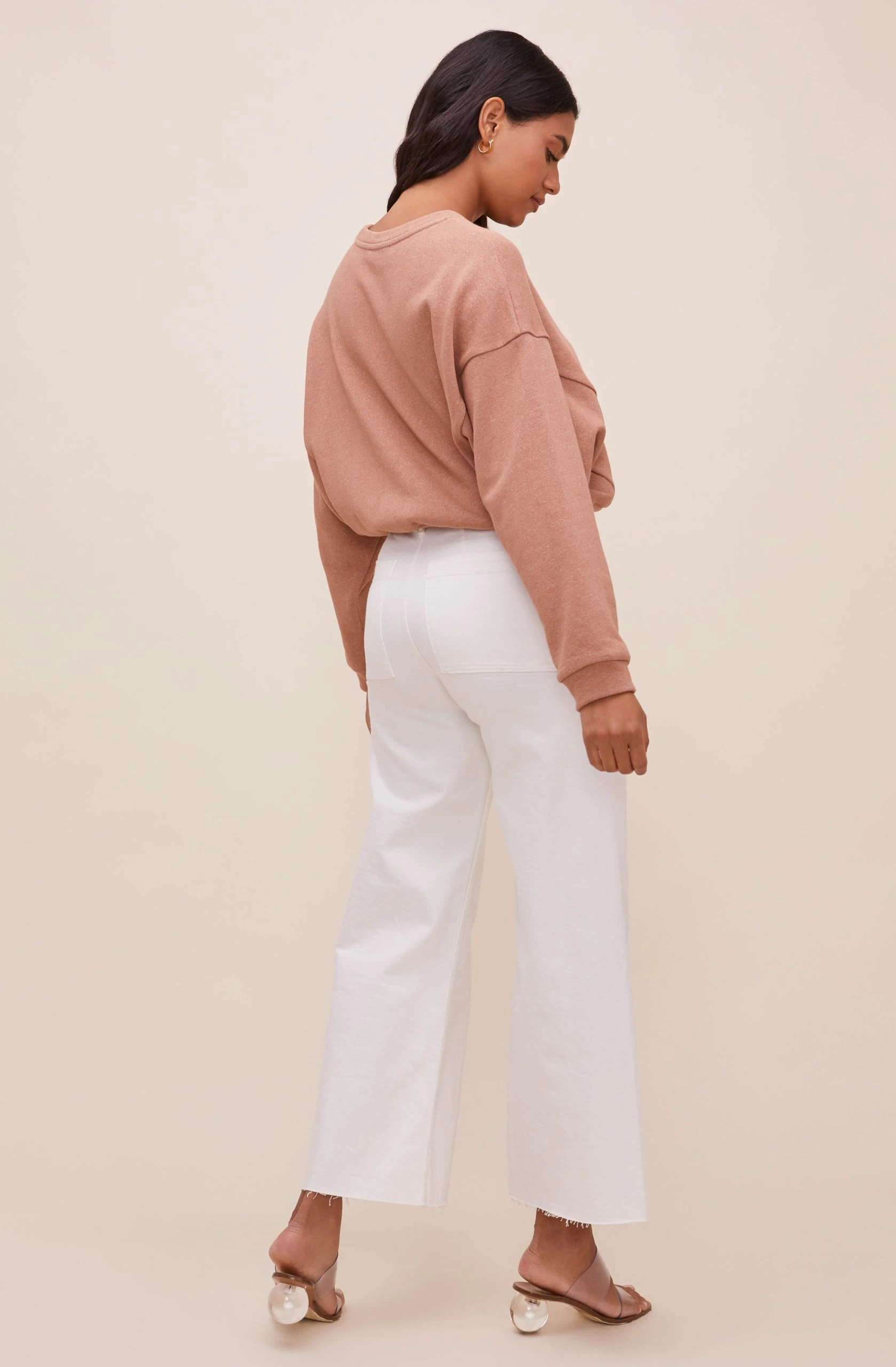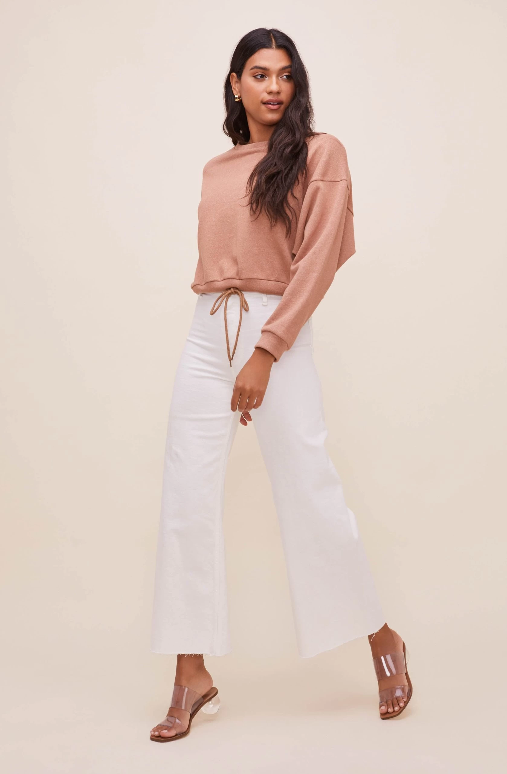 You can still look chic while lounging around. The Haven sweatshirt features a classic crew neckline that descends to long sleeves with dropped shoulders and a flatterint drawstring waist.