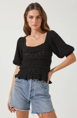 This perfect crochet sweater top features a square neckline that leads to a tiered and textured bodice and ruffle hem. Short puff sleeves. Scoop back with tying straps.