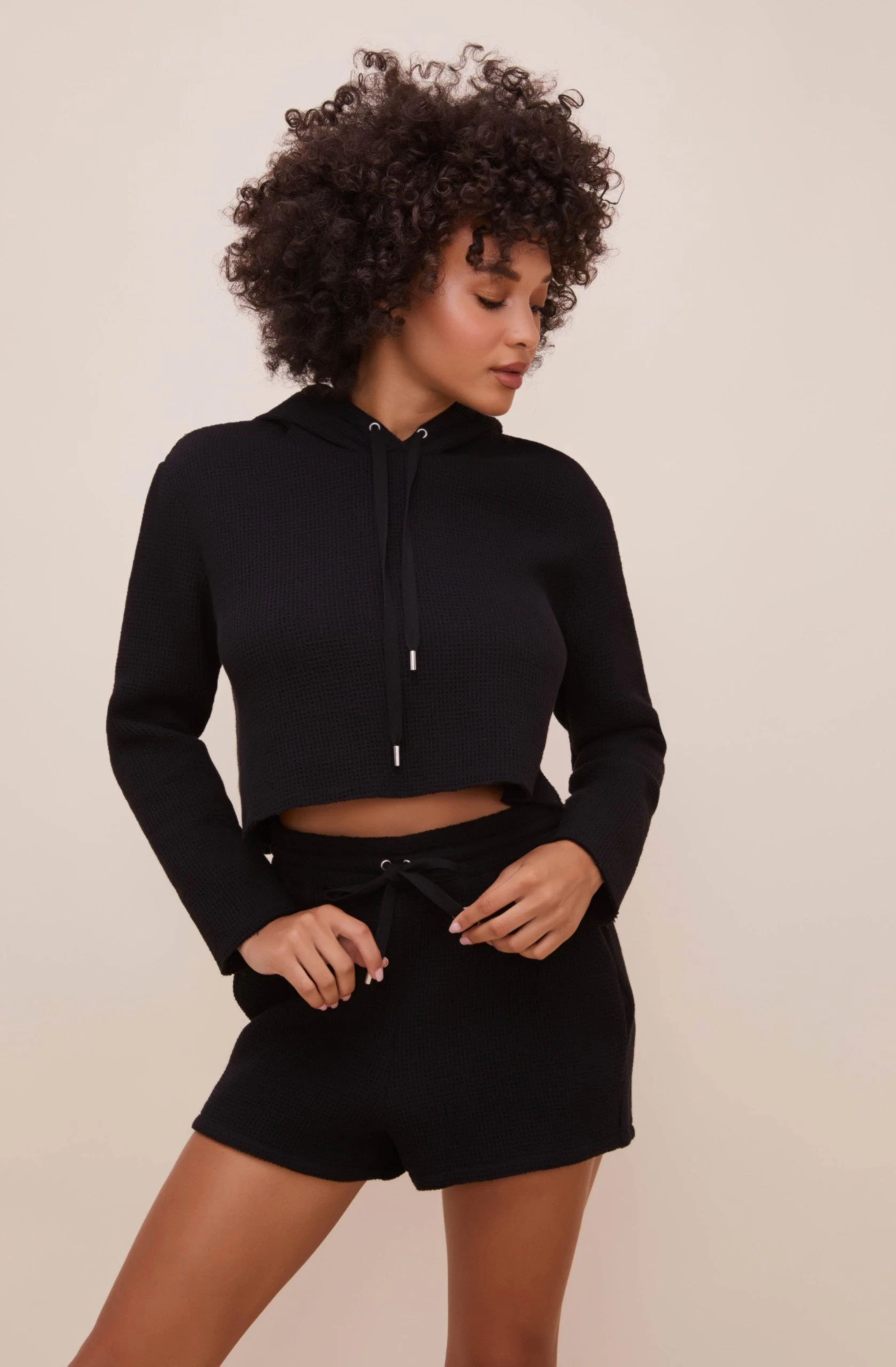 The lounge vibes are strong this season. The Hold Me Hoodie features a cropped silhouette with long sleeves and drawstring accents. Waffle knit. Raw cut hem.