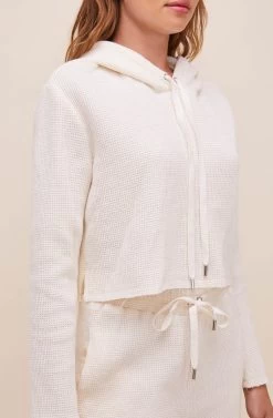 Soft, cozy and chic. The Hold Me Hoodie features a thermal waffle-knit fabrication with an attached hood and drawstring accents. Raw-cut hem and long sleeves.