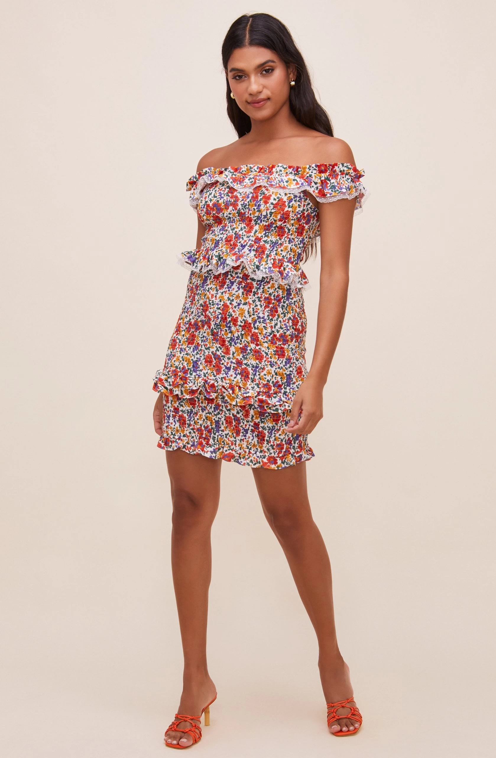 Subtle and sexy, the Isabel dress is a perfect wardrobe addition. Featuring an off-shoulder neckline with ruffle trim that leads to a smocked bodice and mini skirt. Ruffle trim decorates this style throughout along with a bold floral print.