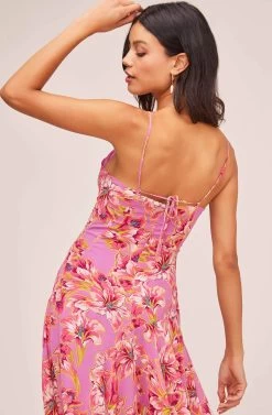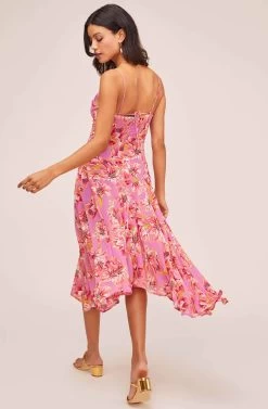 Move with the breeze in this floral print midi dress. Skinny straps support a V neckline and leads down to a fitted bodice. Asymmetrical hemline adds romance to the silhouette. Tie back closure.