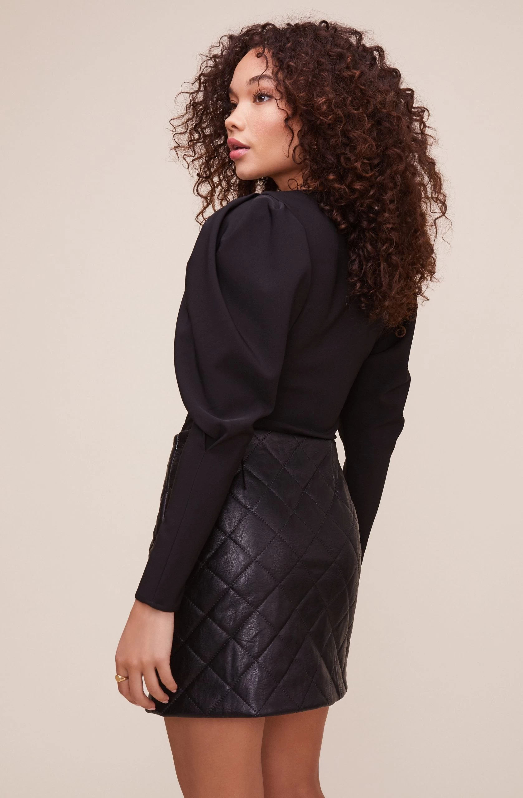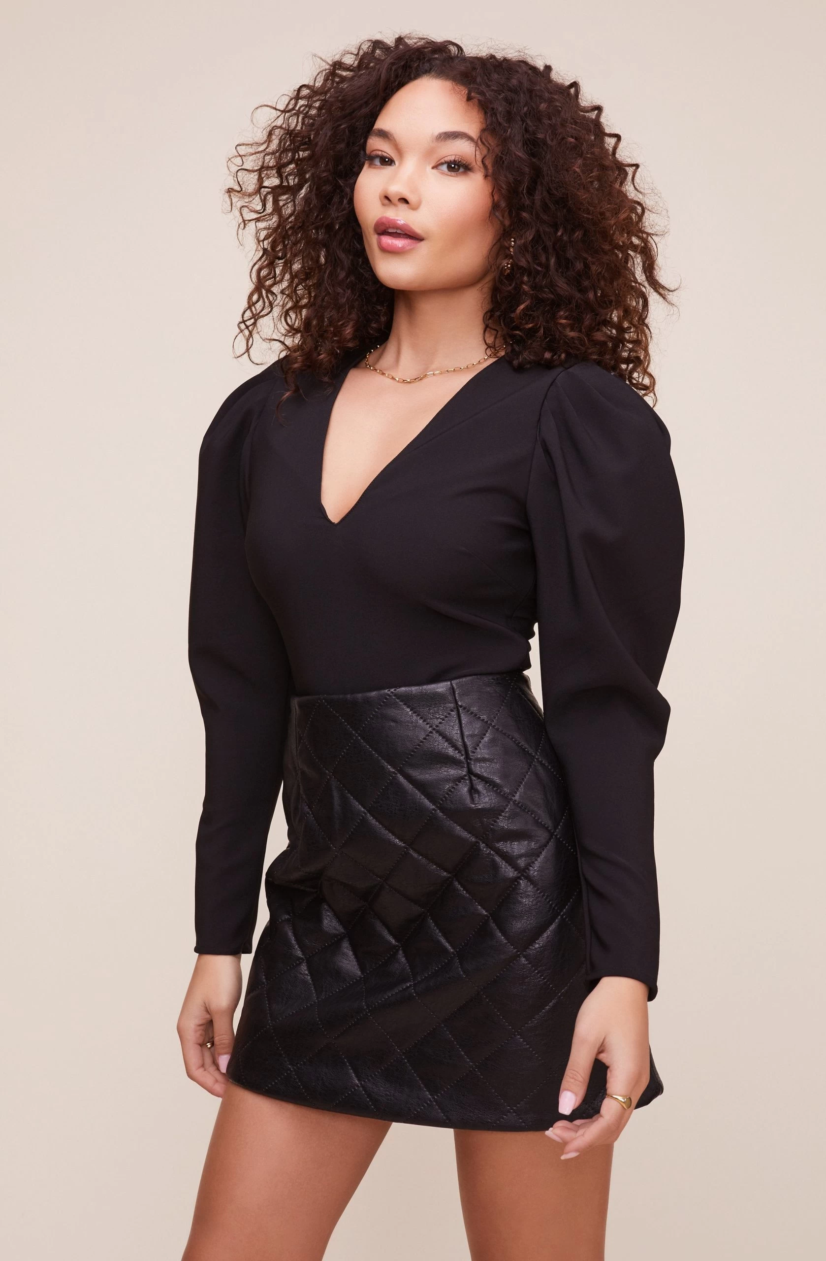 The Johanna Bodysuit isn’t afraid to make a statement. It features a sexy V neckline that leads to a fitted bodice. Long sleeves with puff shoulders make this style unforgettable!