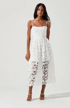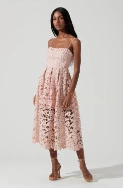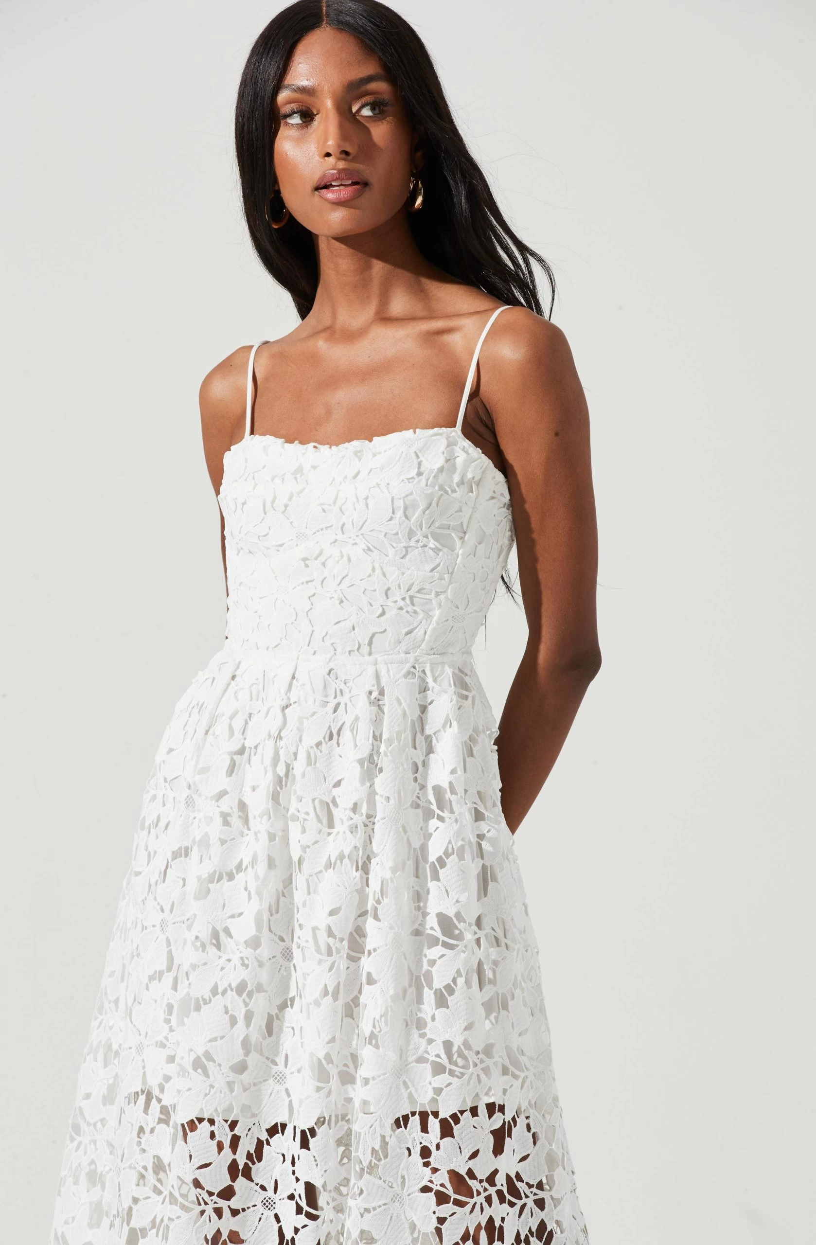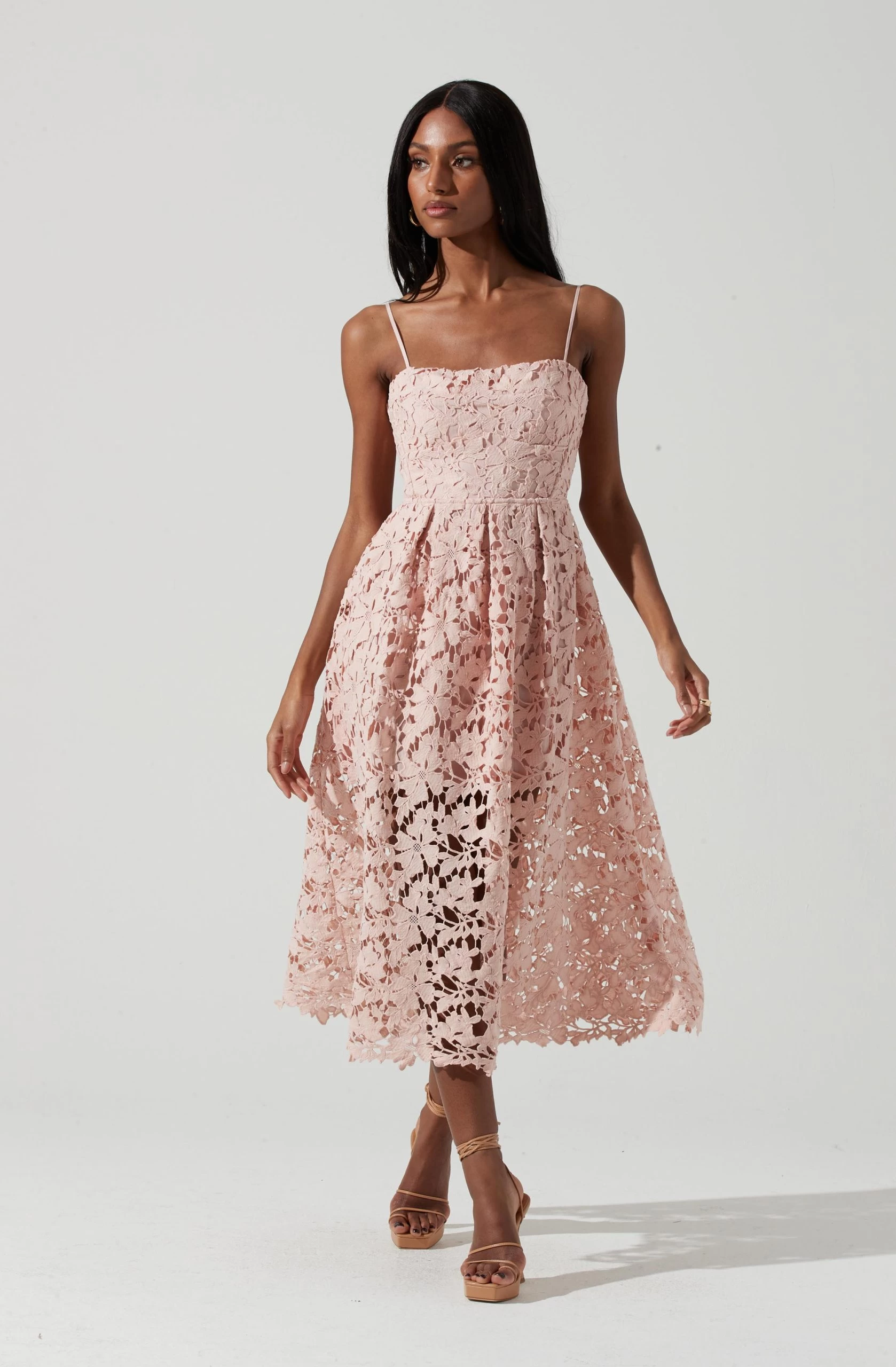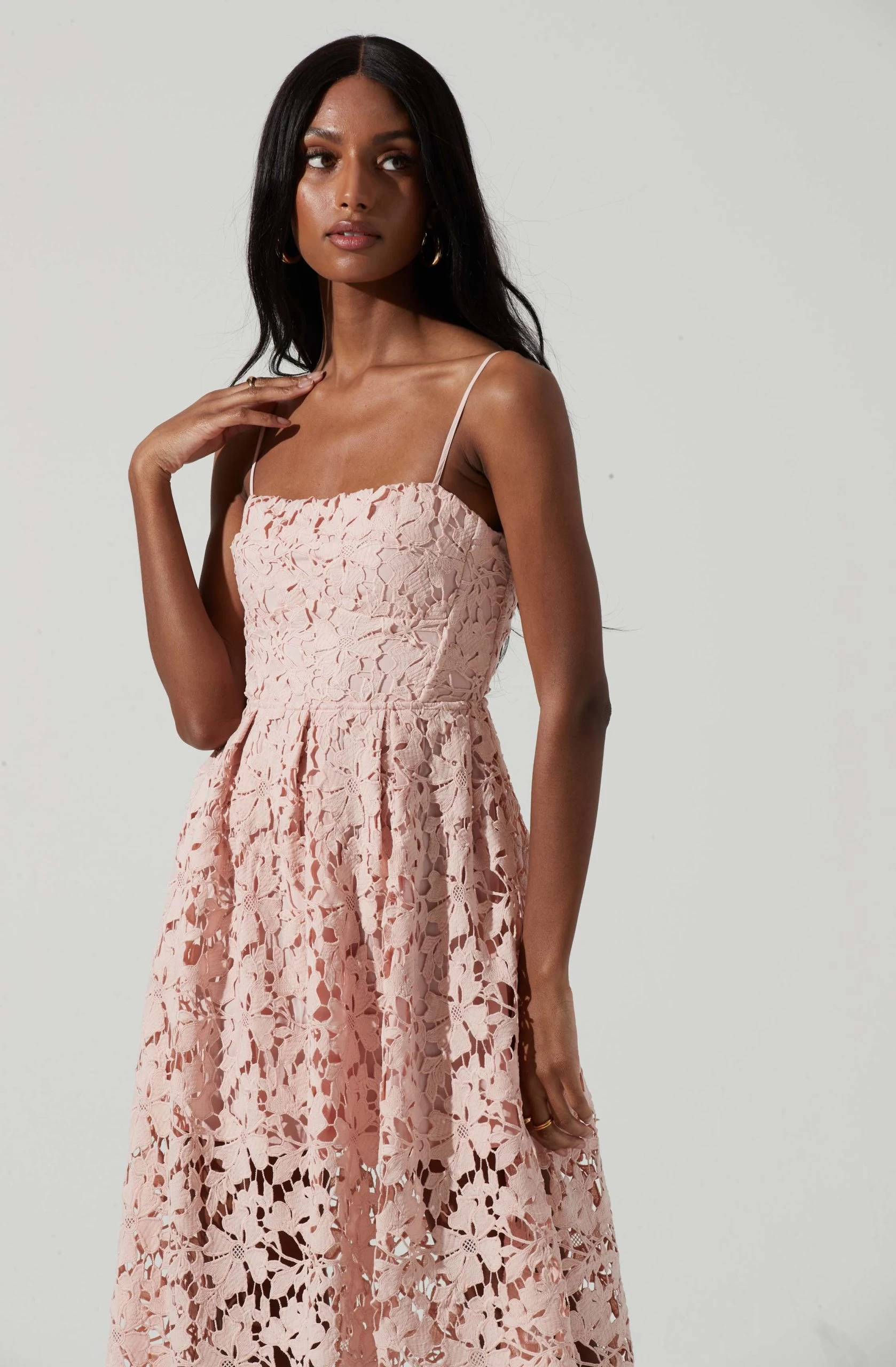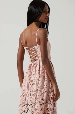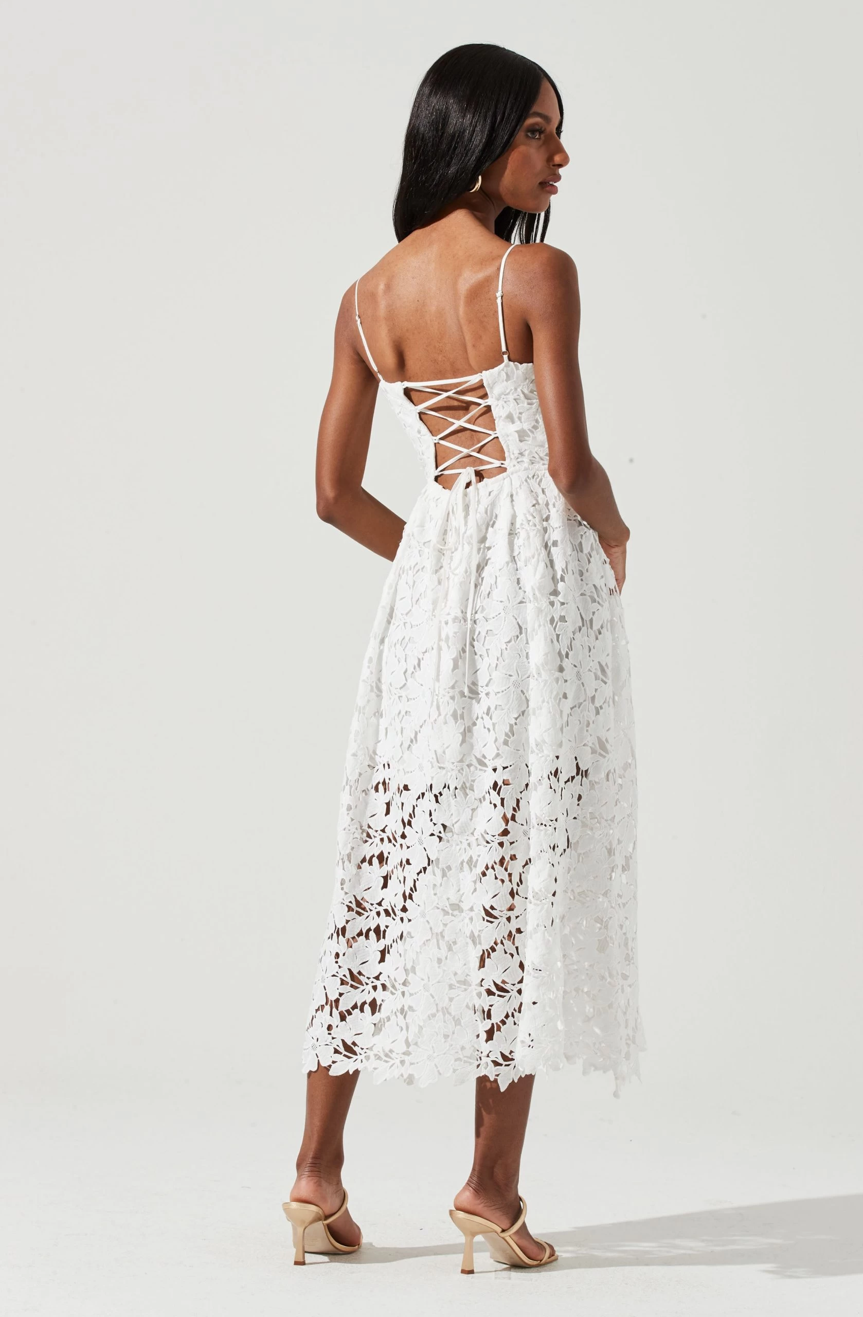 The Joyce Dress features a classic lace overlay that starts with a square neckline. Corset-style bodice features an open-back, lace-up detail. Pleated A-line midi skirt is partially lined.