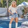 Casual and cool, this abstract print top has it all. Sweetheart neckline is supported by delicate spaghetti straps. Asymmetrical mock horn button placket leads to a tie front accent and slightly ruffled hem. Smocked back.