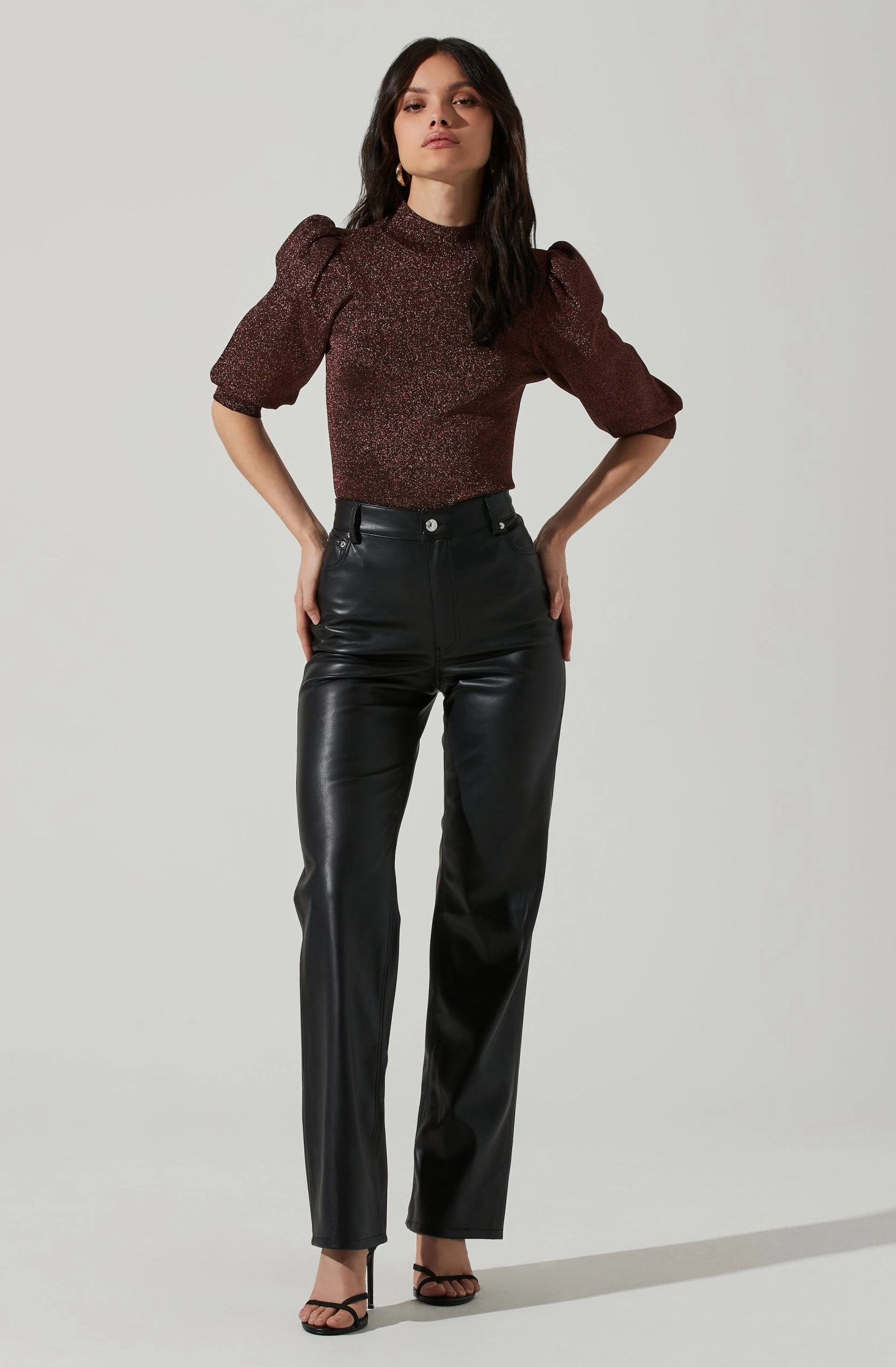 The Kay sweater features a chic metallic finish. Mock neckline leads to a fitted silhouette. Short puff sleeves. Keyhole back.