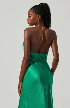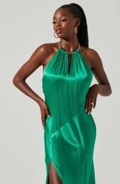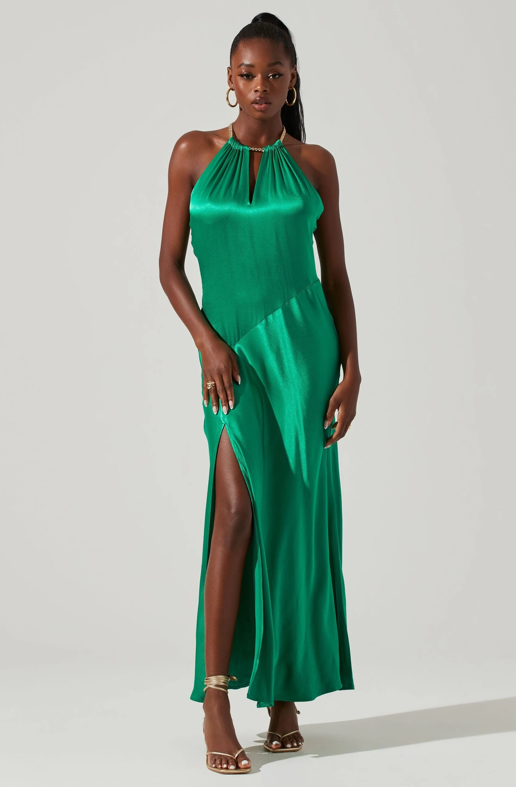 The Kazia Dress features a satin finish that instantly elevates. Halter neckline is supported by a statement chain strap. Keyhole accent at the bust. Side slit accent. Open back. Concealed back zip closure.