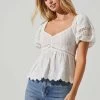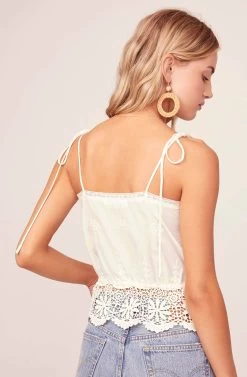 Show off your sun-kissed glow with a white top. Self-tie spaghetti straps support a square neckline. Intricate crochet details add a touch of whimsy and slightly cinched waist adds structure. This chic top ends with a scalloped lace trim.