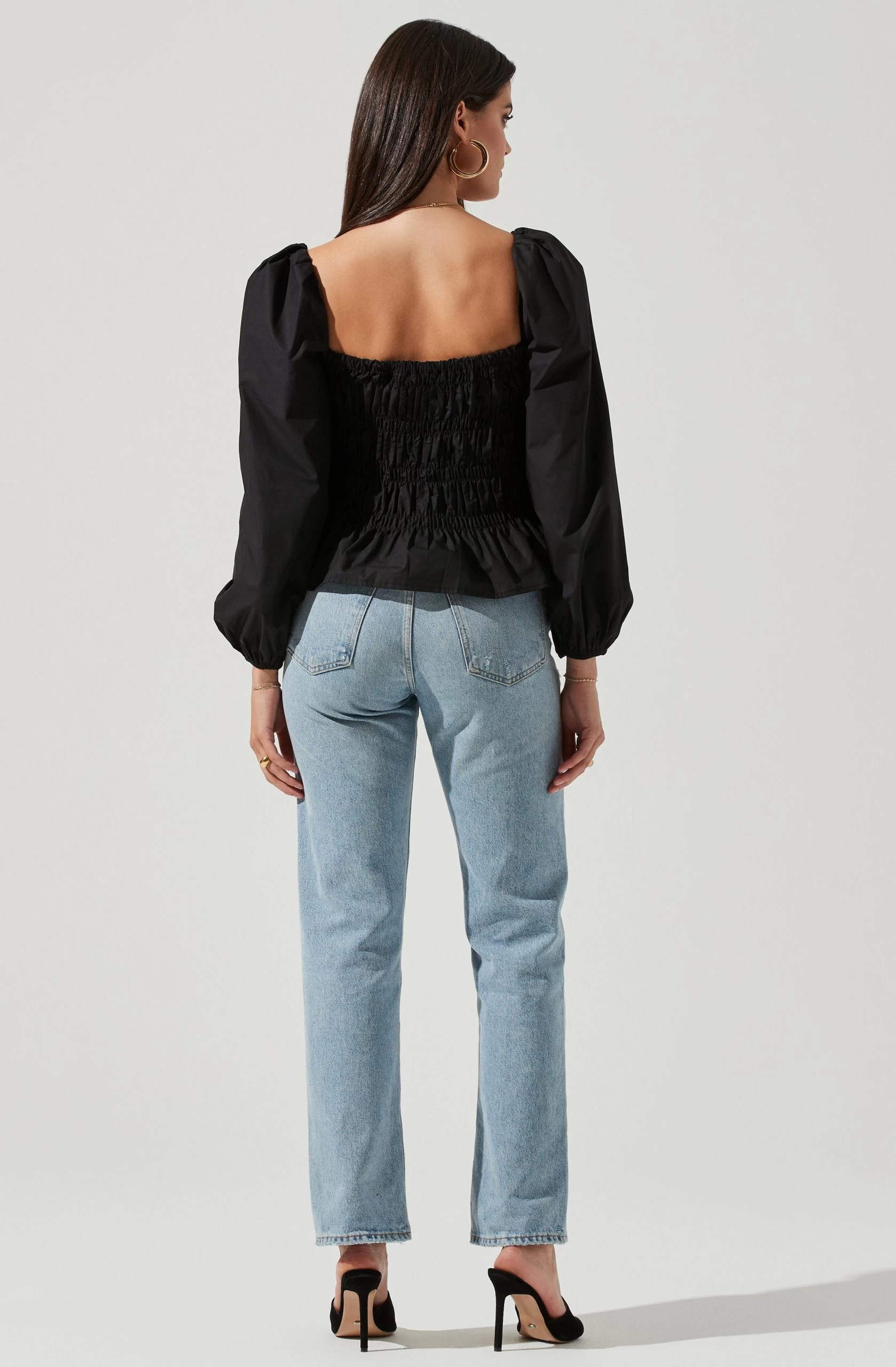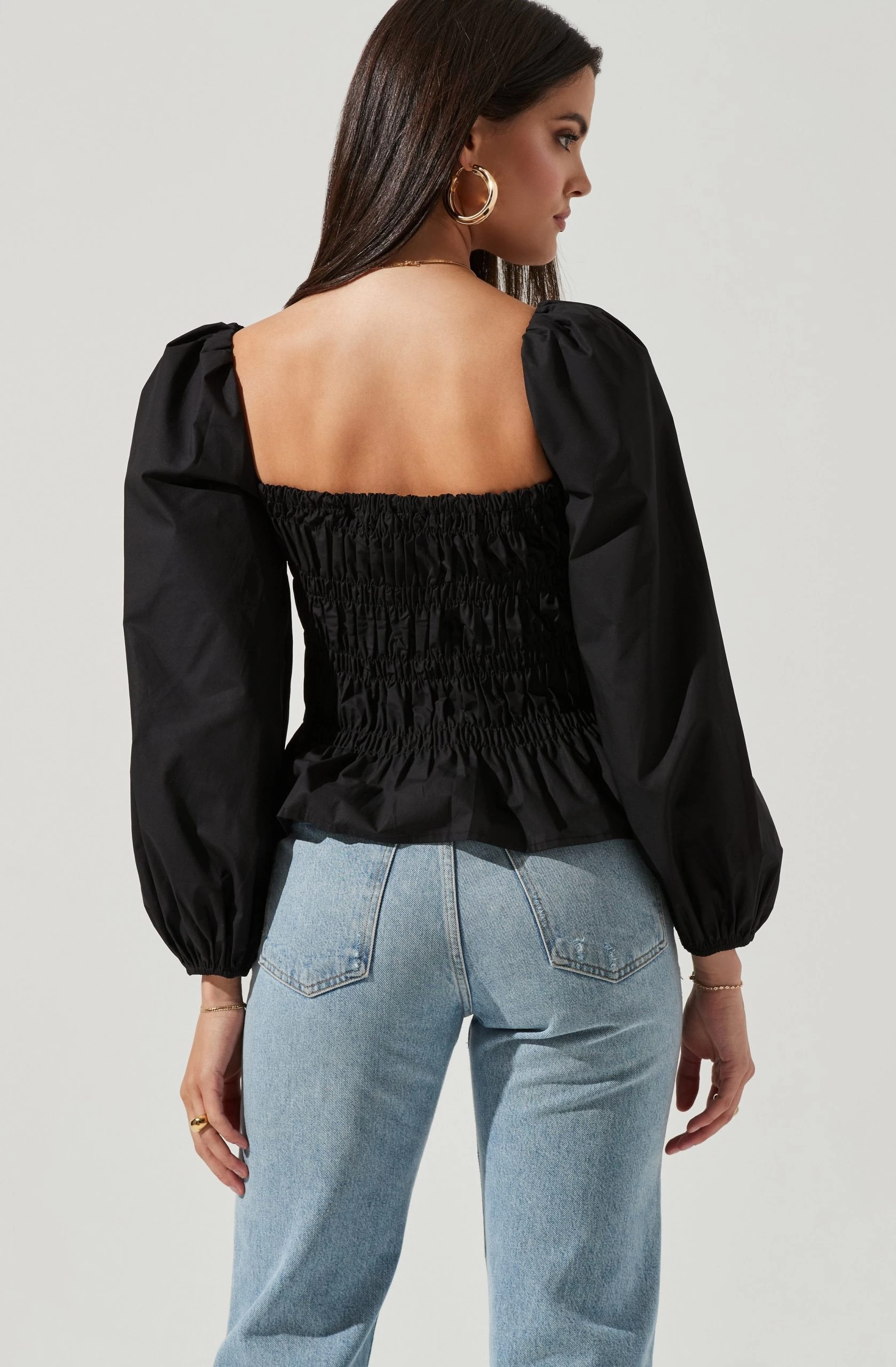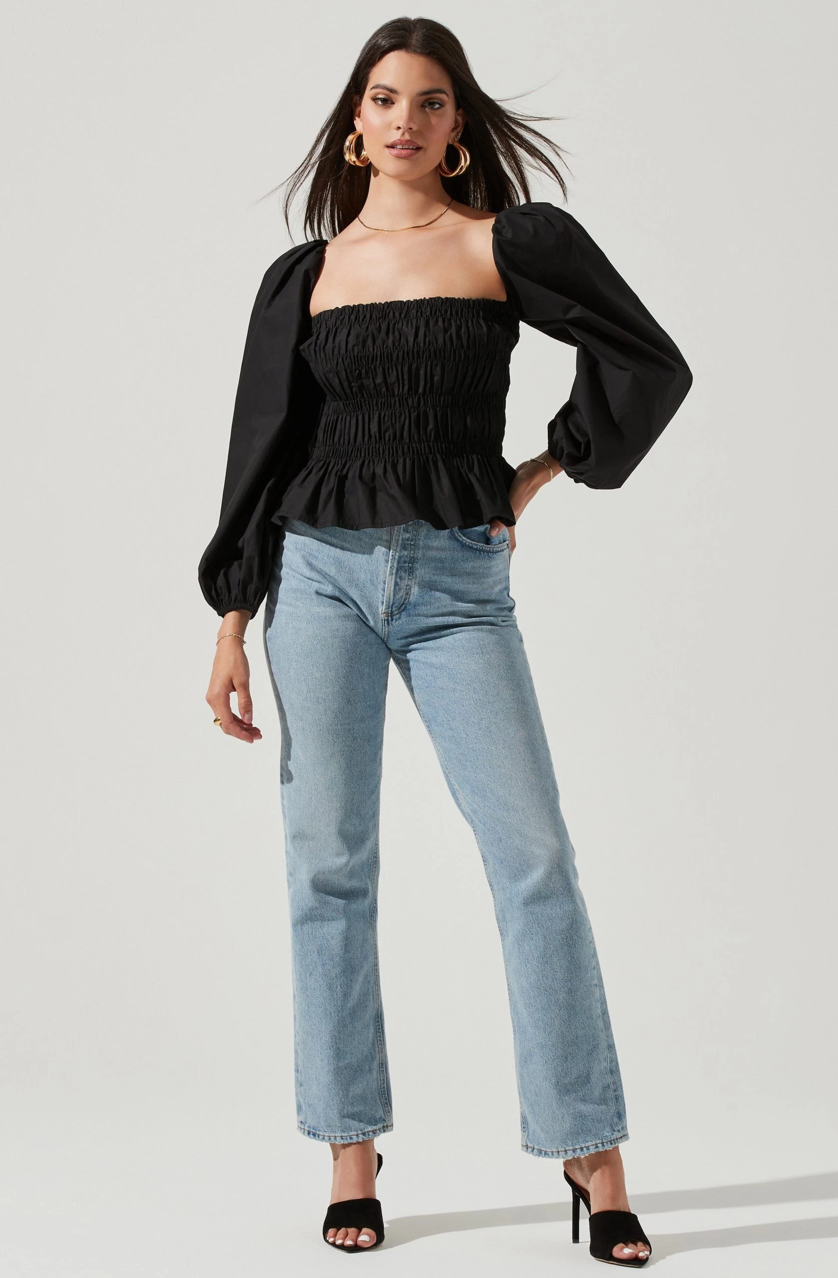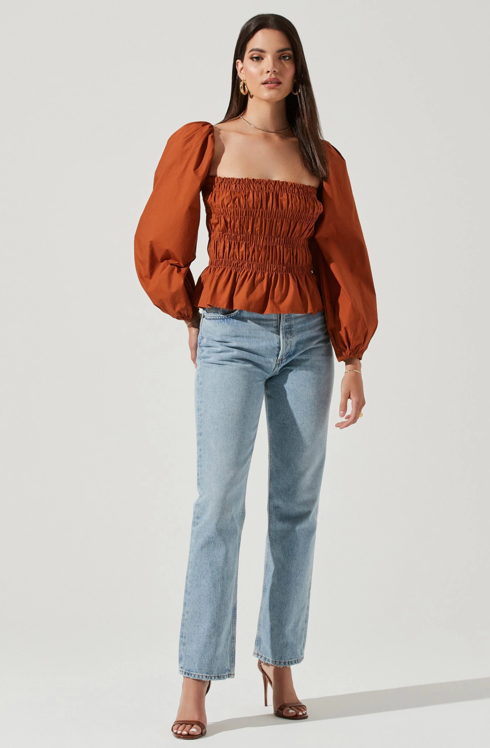 This dreamy top features a square neckline that leads to a smocked design and subtle peplum hem. Long puff sleeves with elasticized cuffs.