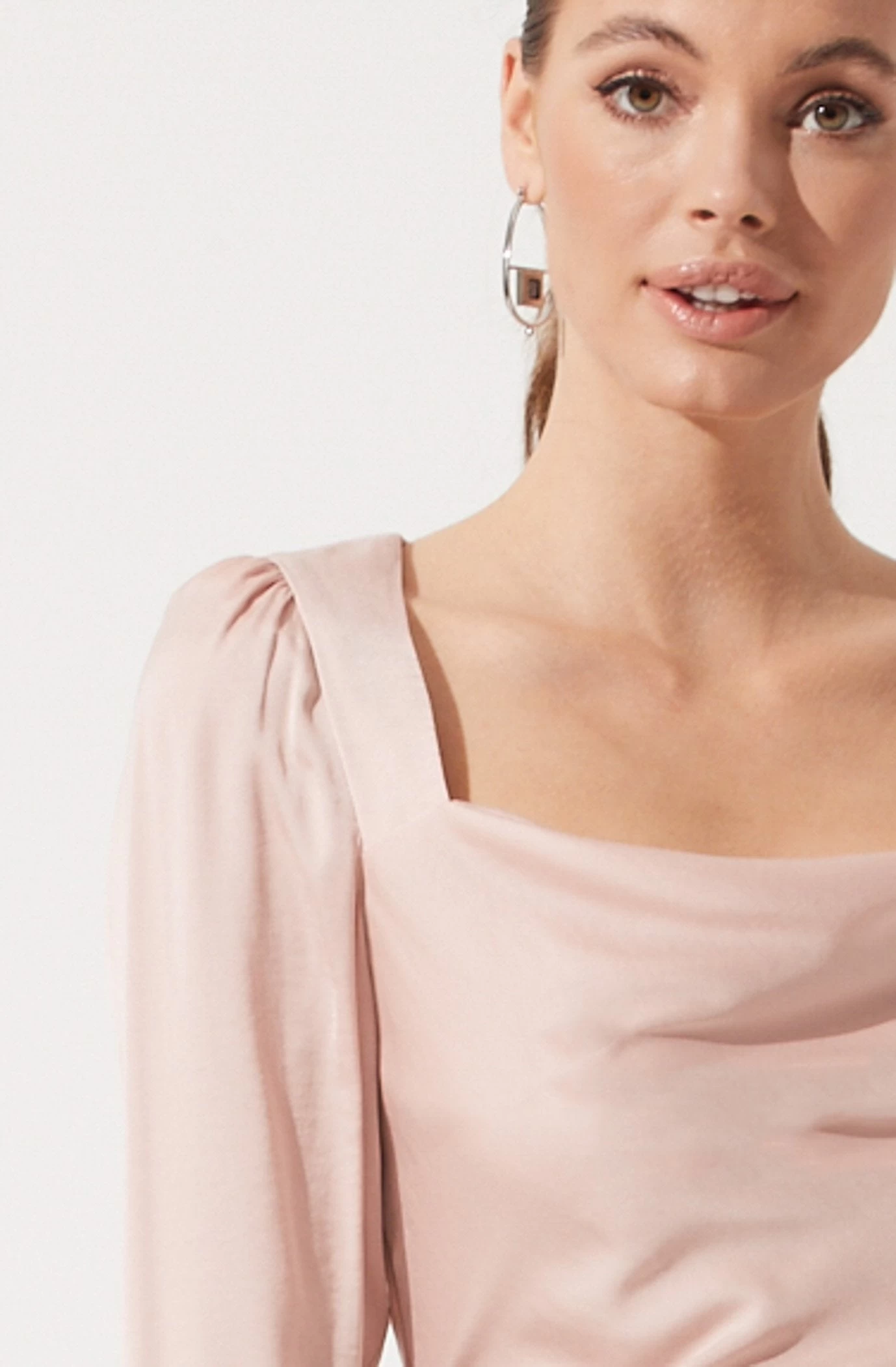 A dressy top for any occasion. It features a flattering cowl neck that descends to a fitted bodice and features a statement cutout back. Long sleeves. Smocked back.