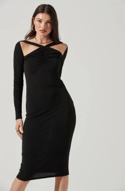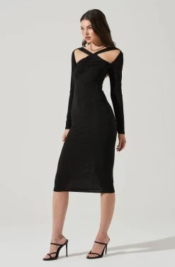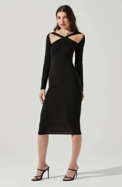 This chic and elegant midi dress features a cutout neckline with a cinched bust and bodycon silhouette. Long sleeves. Midi length. Slight stretch.