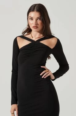 Long Sleeve Cinched Bust Cutout Midi Dress