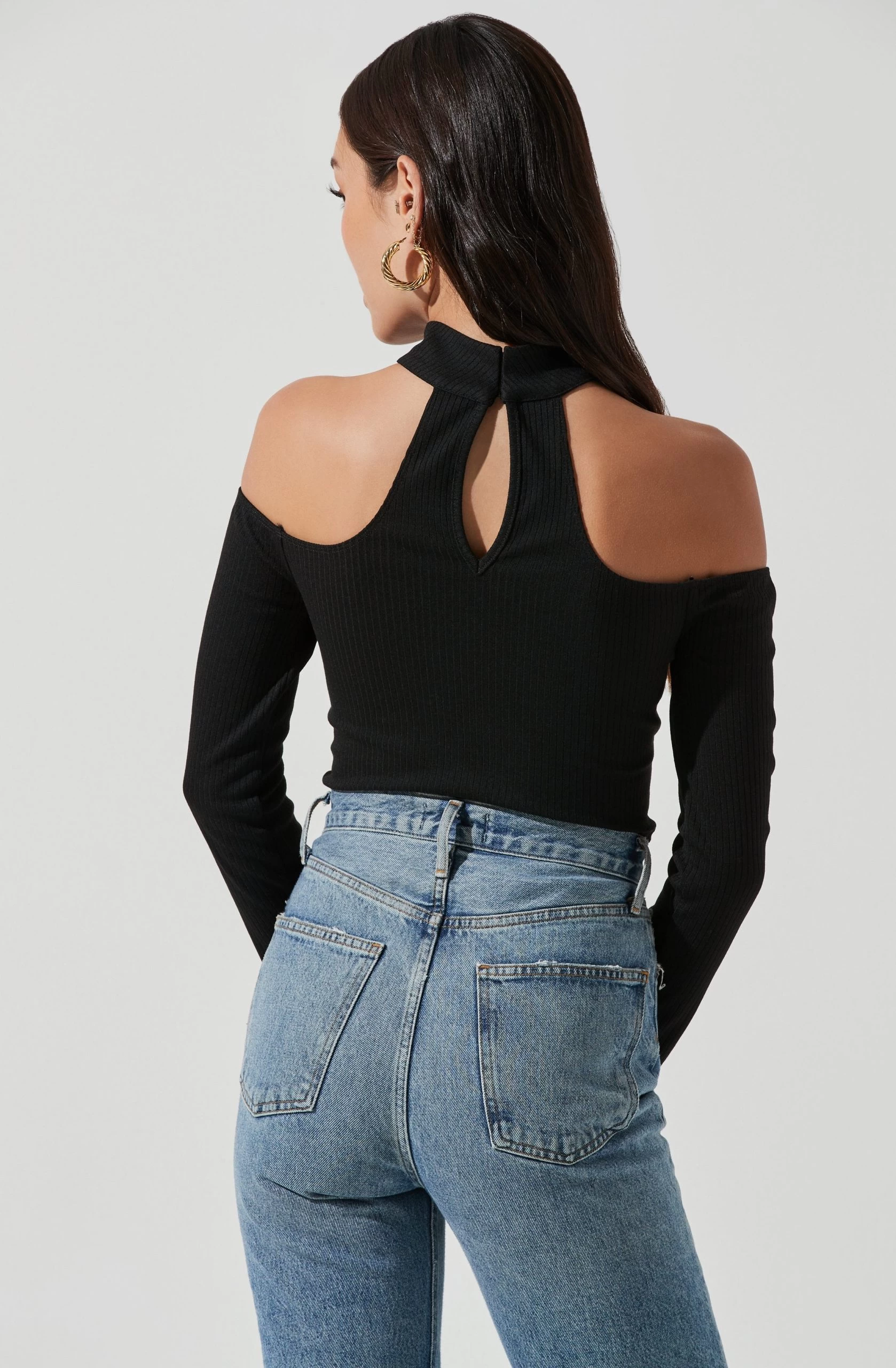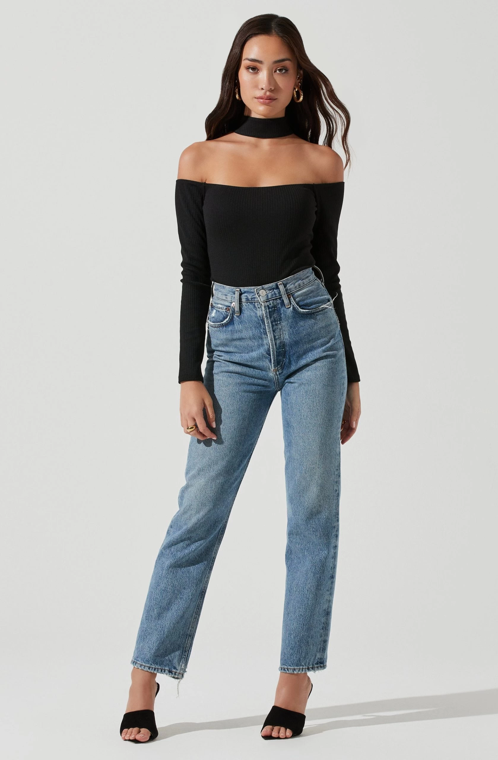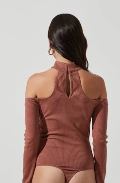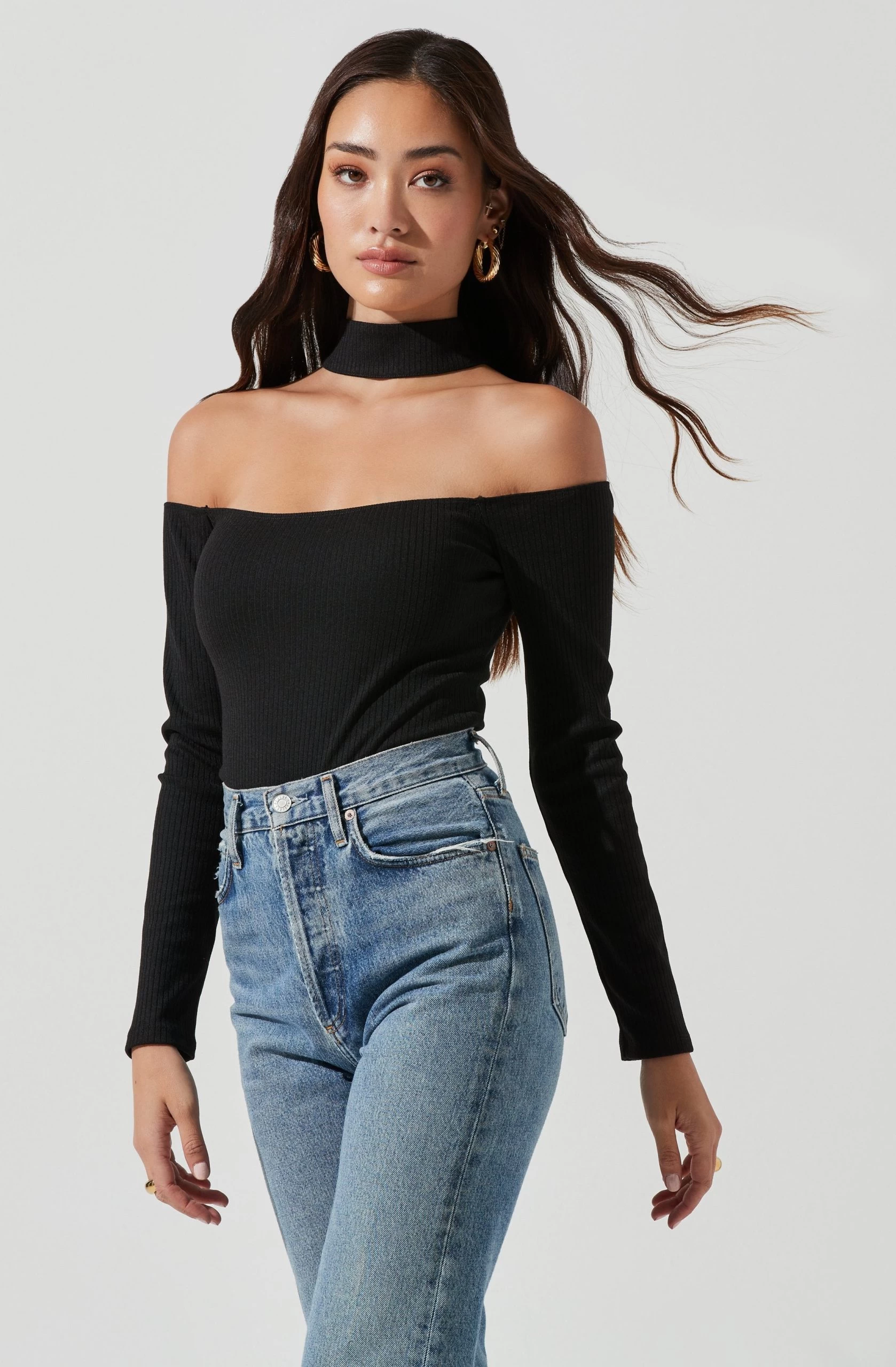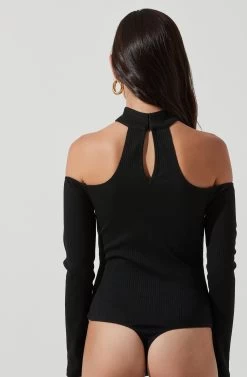 This statement bodysuit features an attached choker accent that leads to an off-shoulder neckline and long sleeves. Keyhole back. Attached thong bottoms have snap button closures.