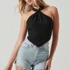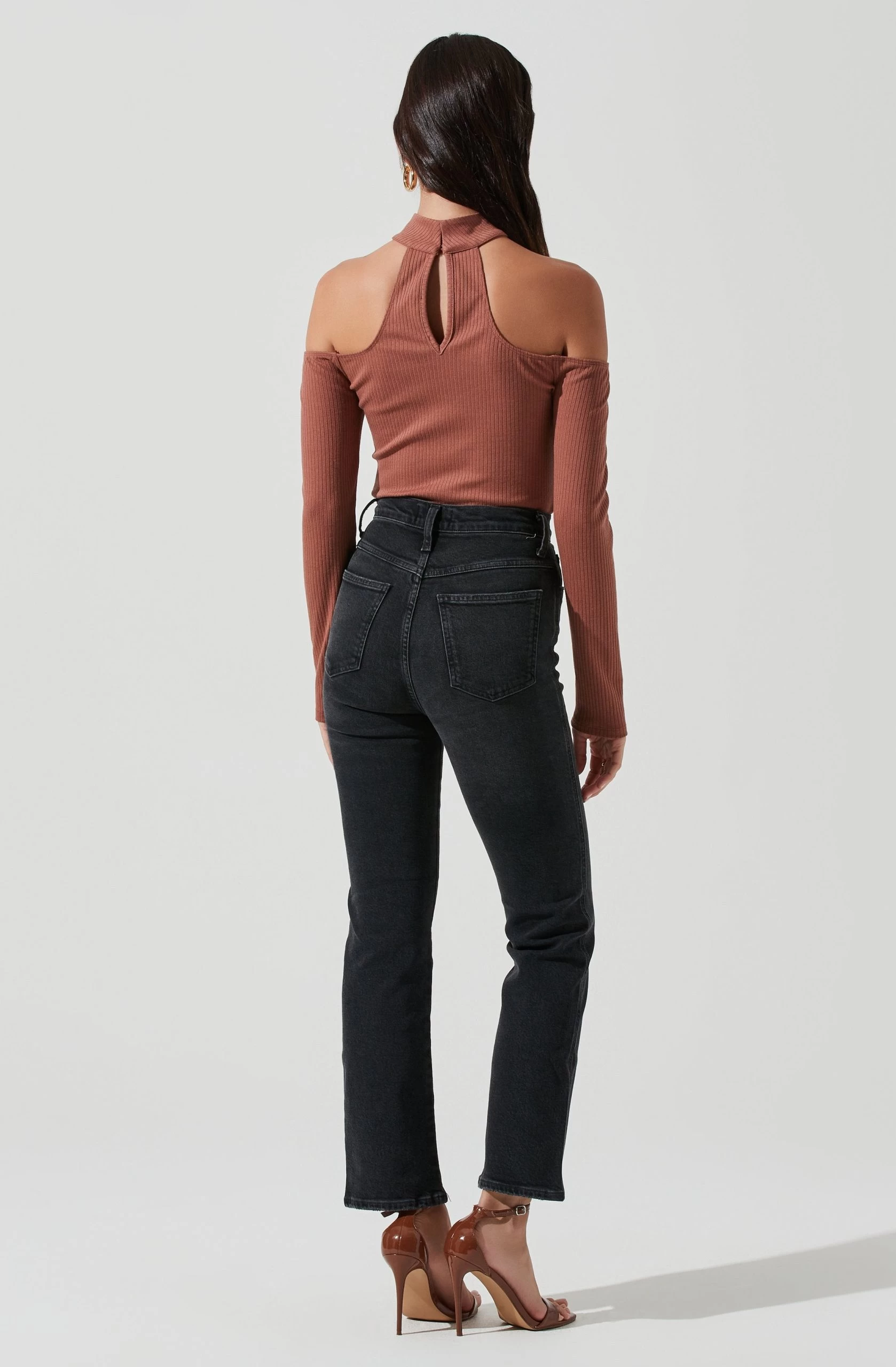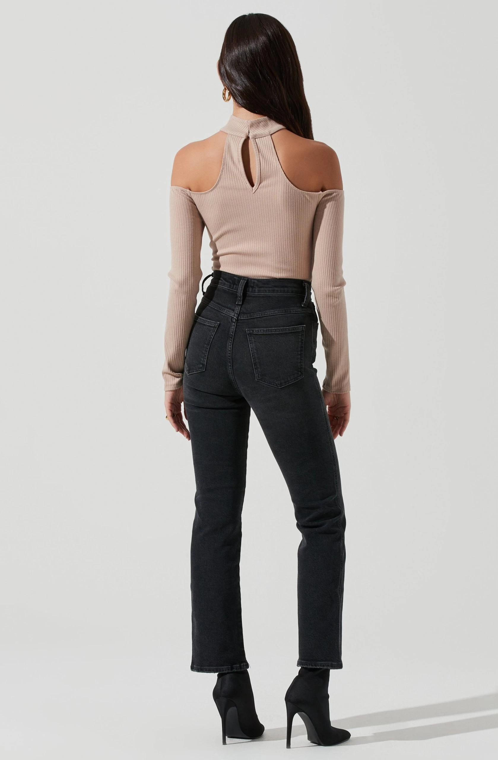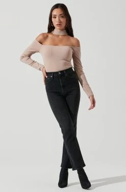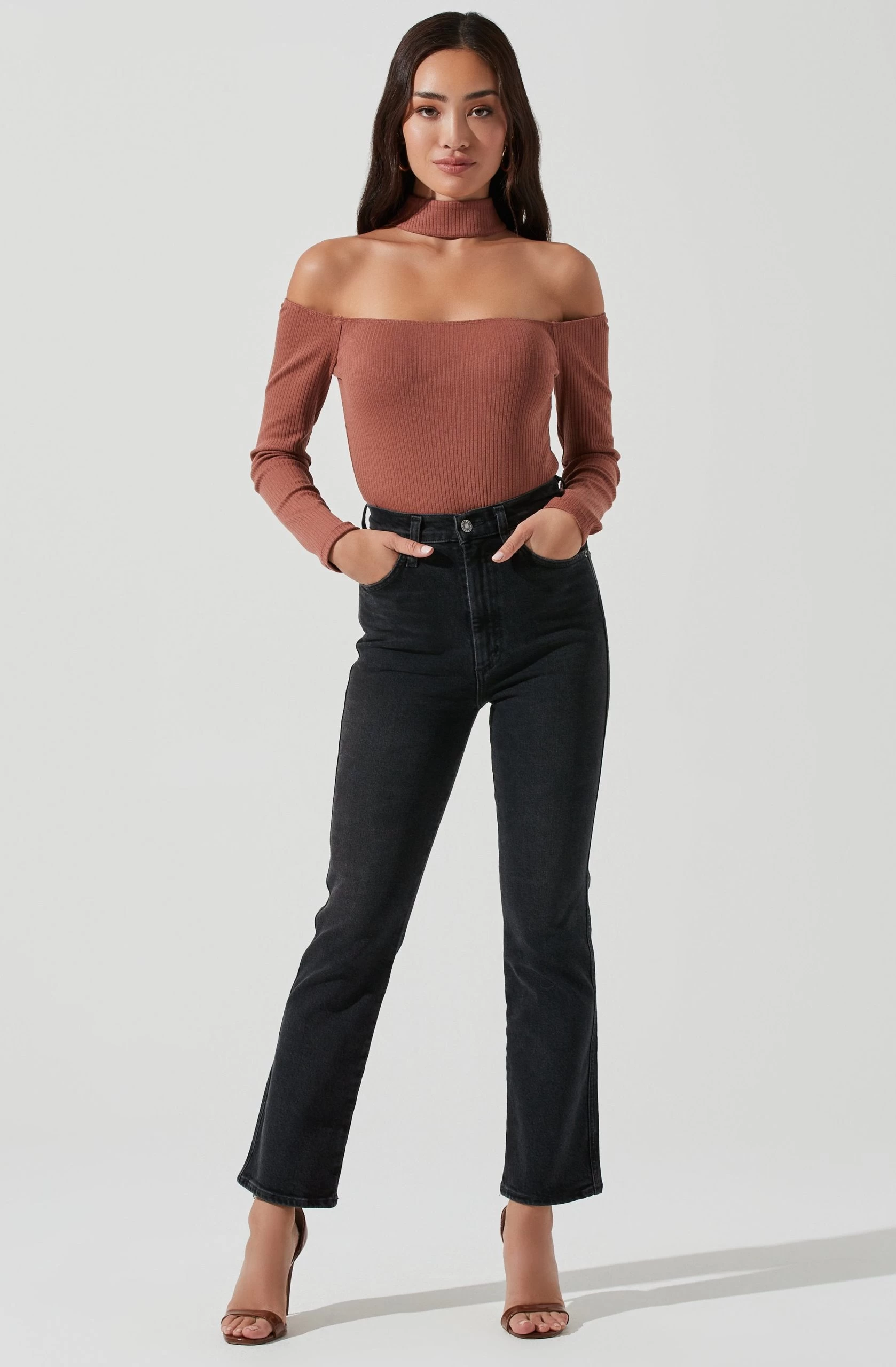 This statement bodysuit features an attached choker accent that leads to an off-shoulder neckline and long sleeves. Keyhole back. Attached thong bottoms have snap button closures.