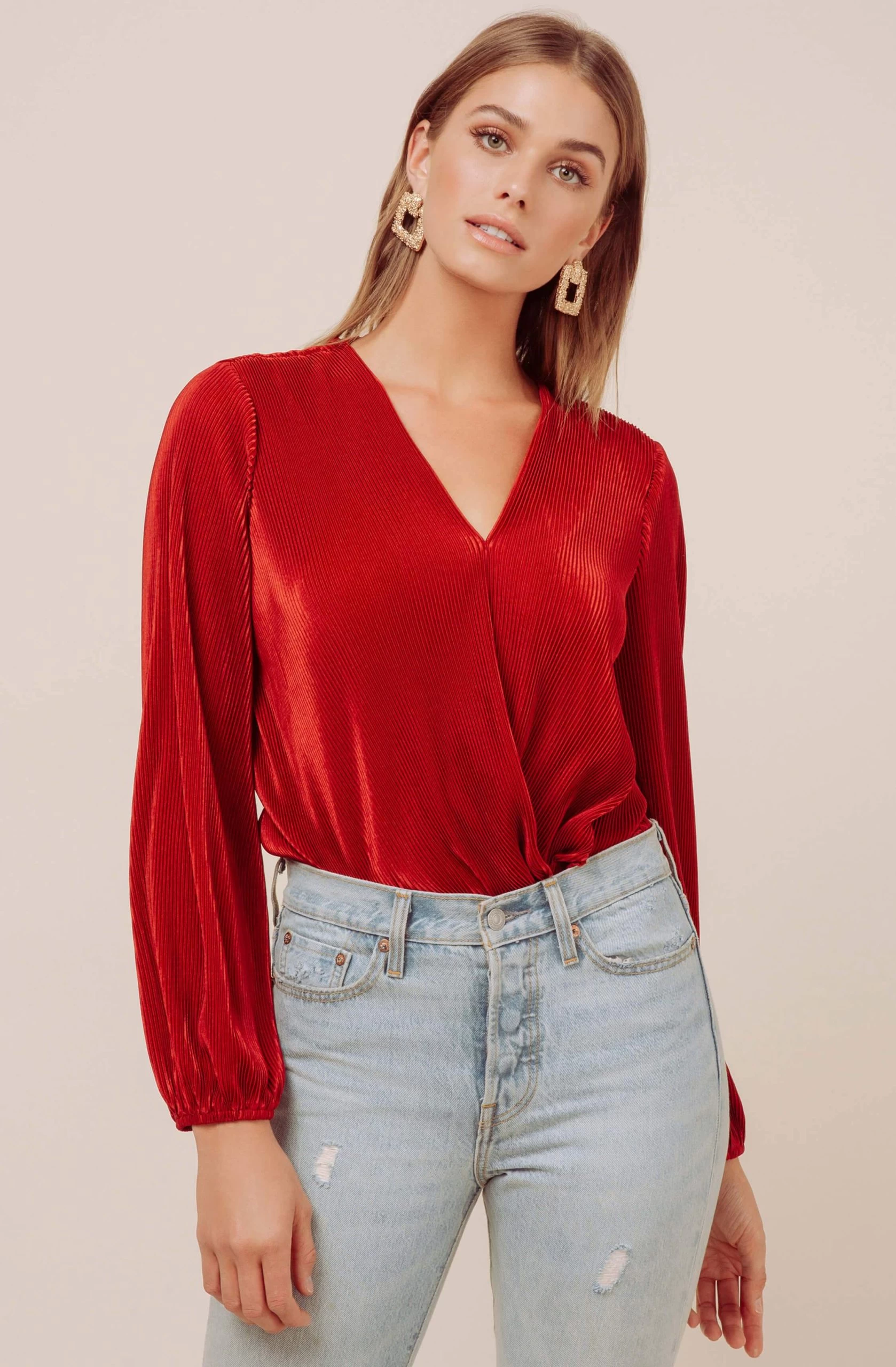 Chic in jewel tones! This elevated bodysuit features a luxe plisse texture throughout. V neckline leads to a wrap front that accentuates your figure. Long puff sleeves for added drama.