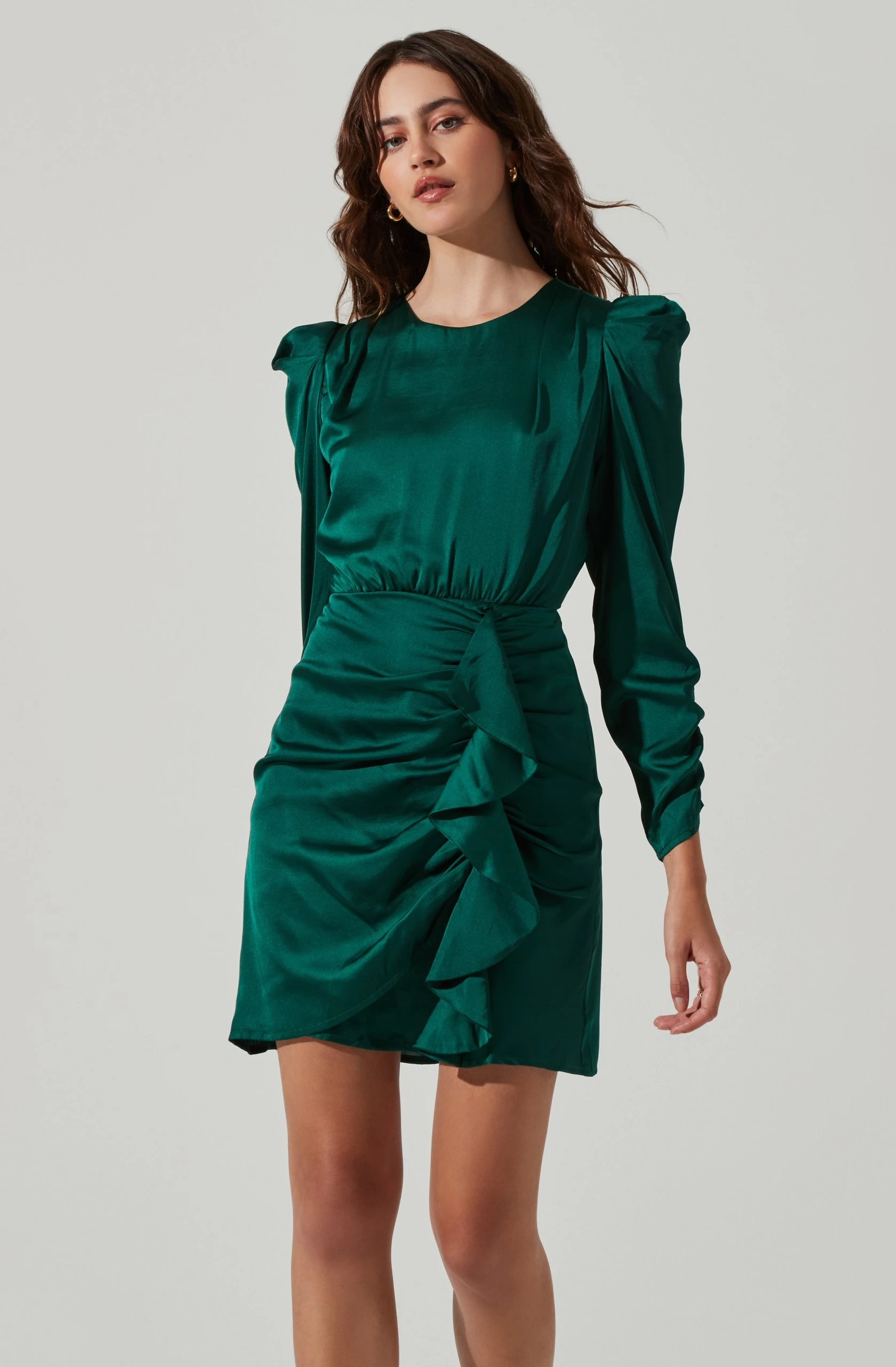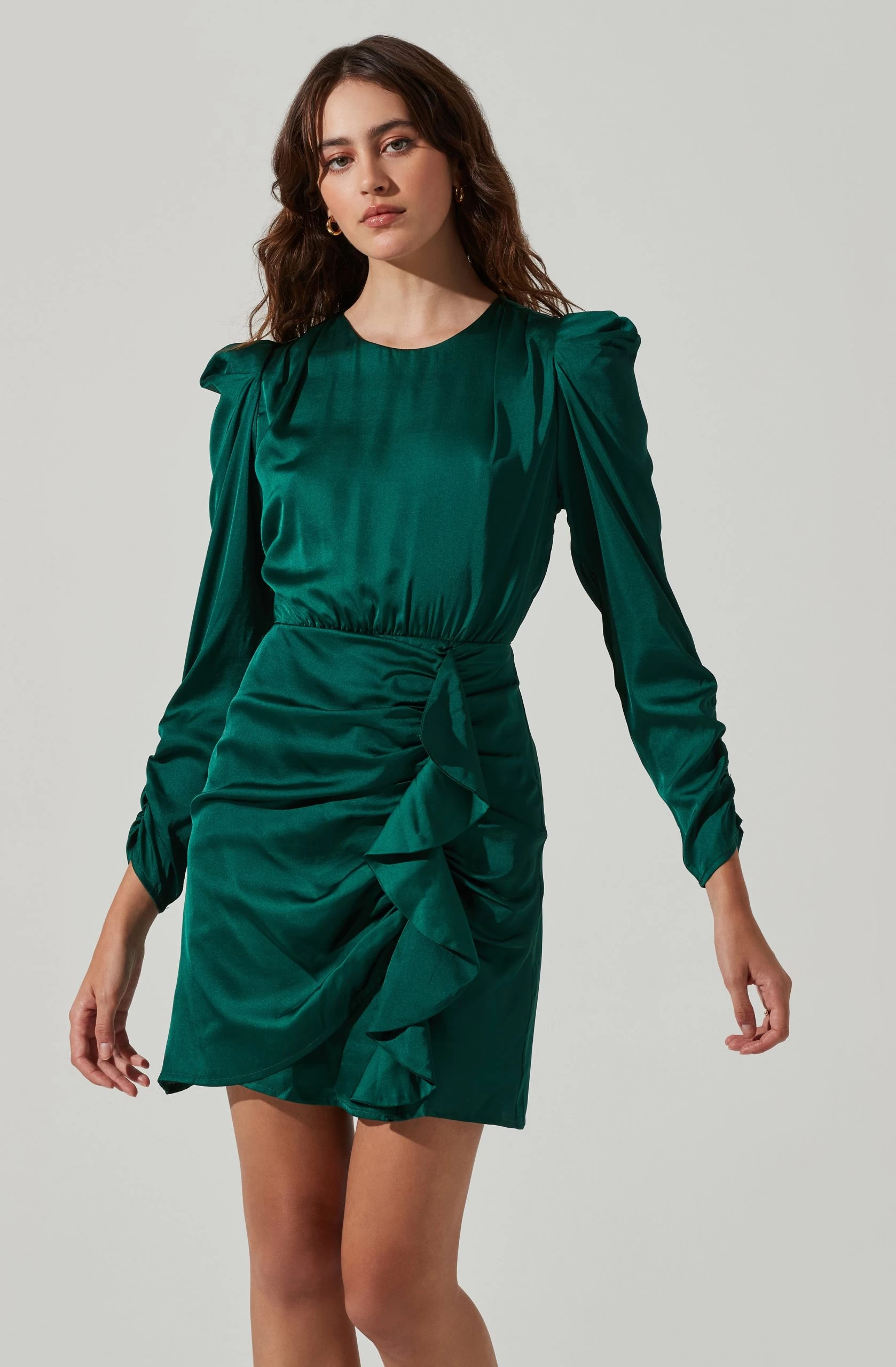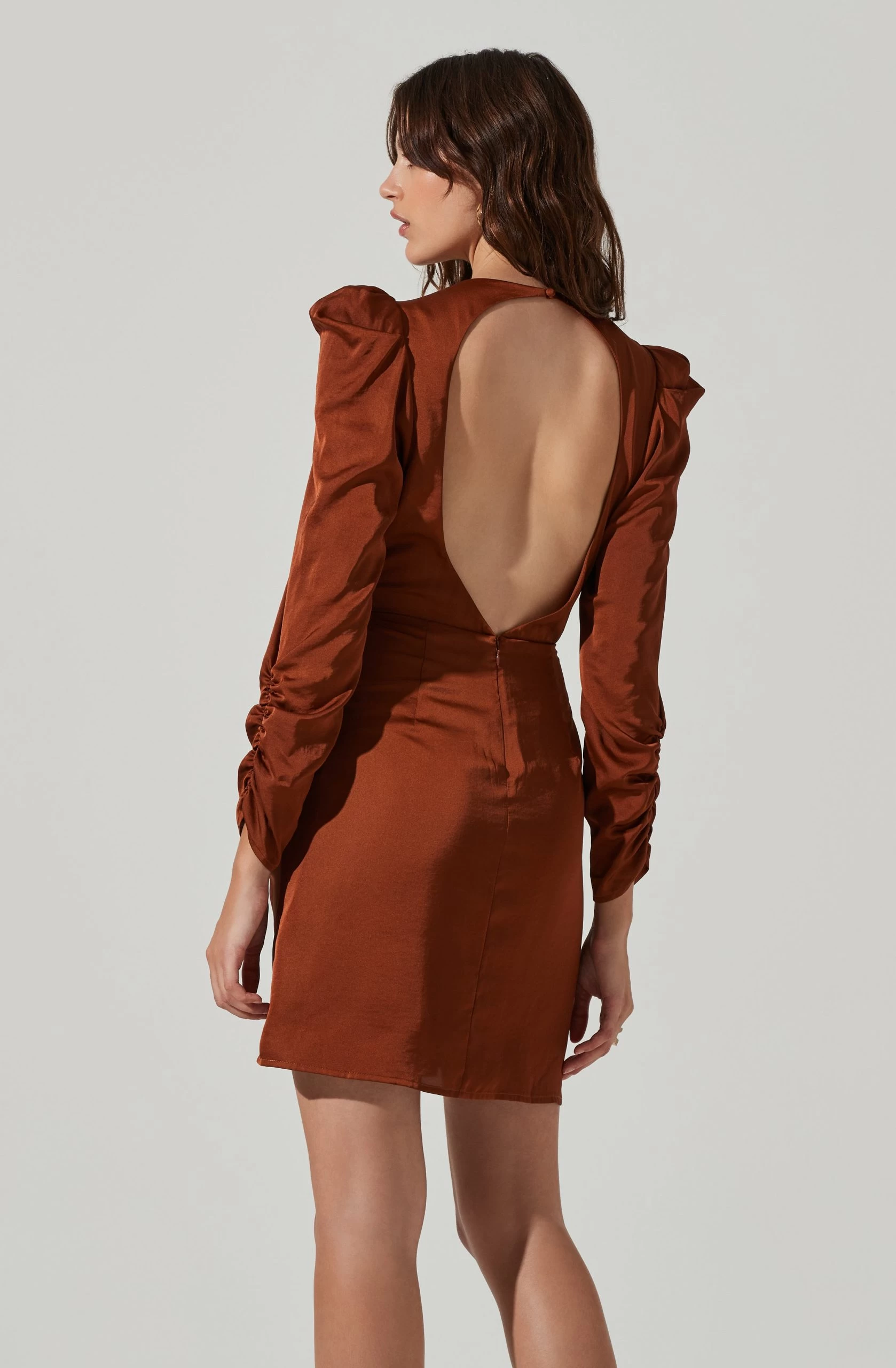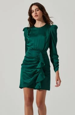 This satin dress features a ruffle mini skirt and long ruched sleeves. Open back. Concealed back zip closure.