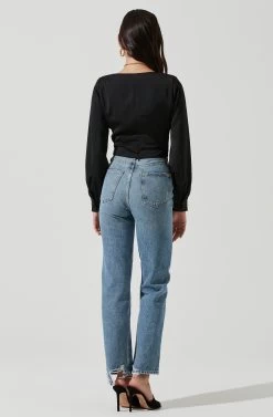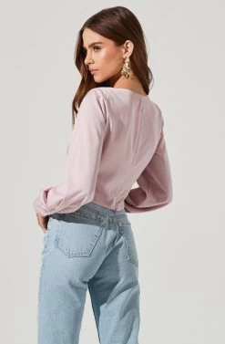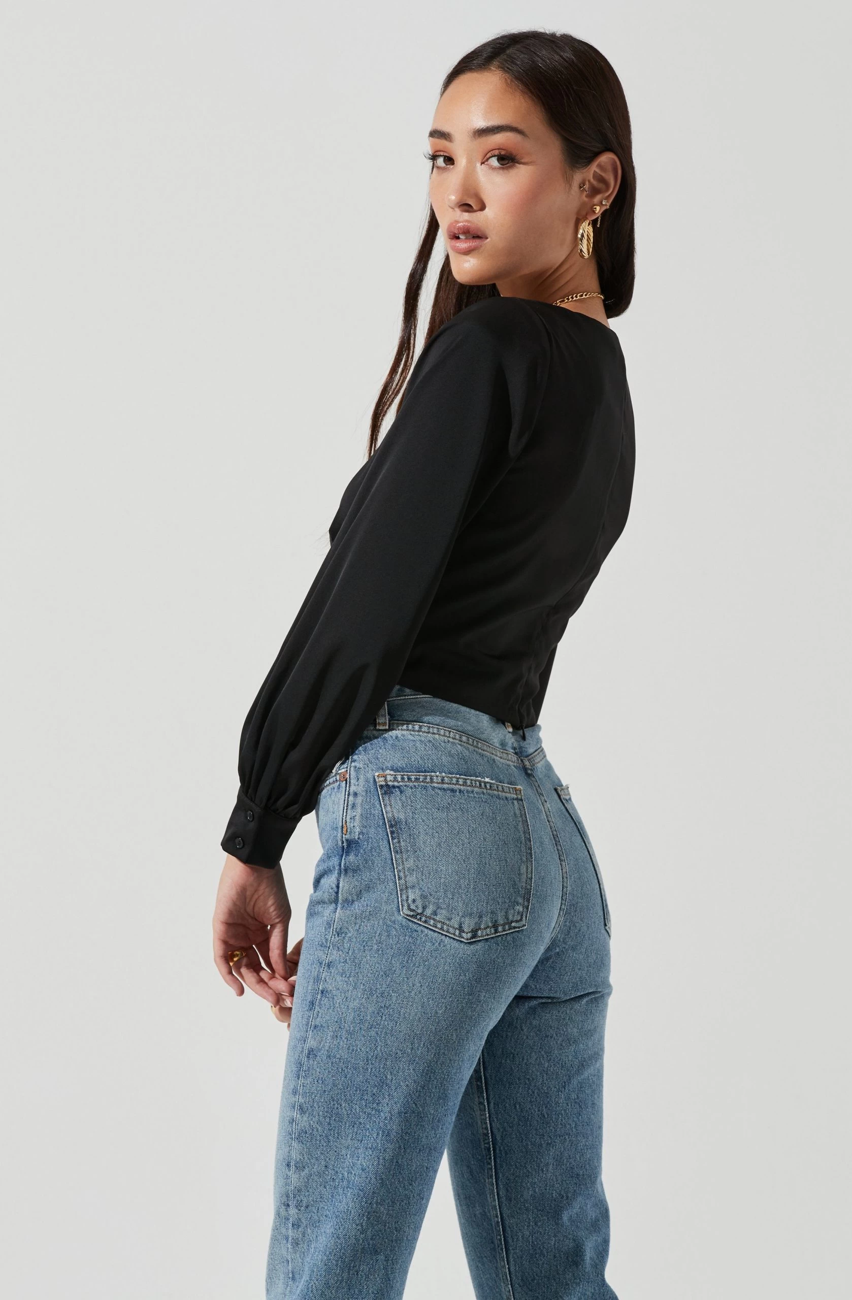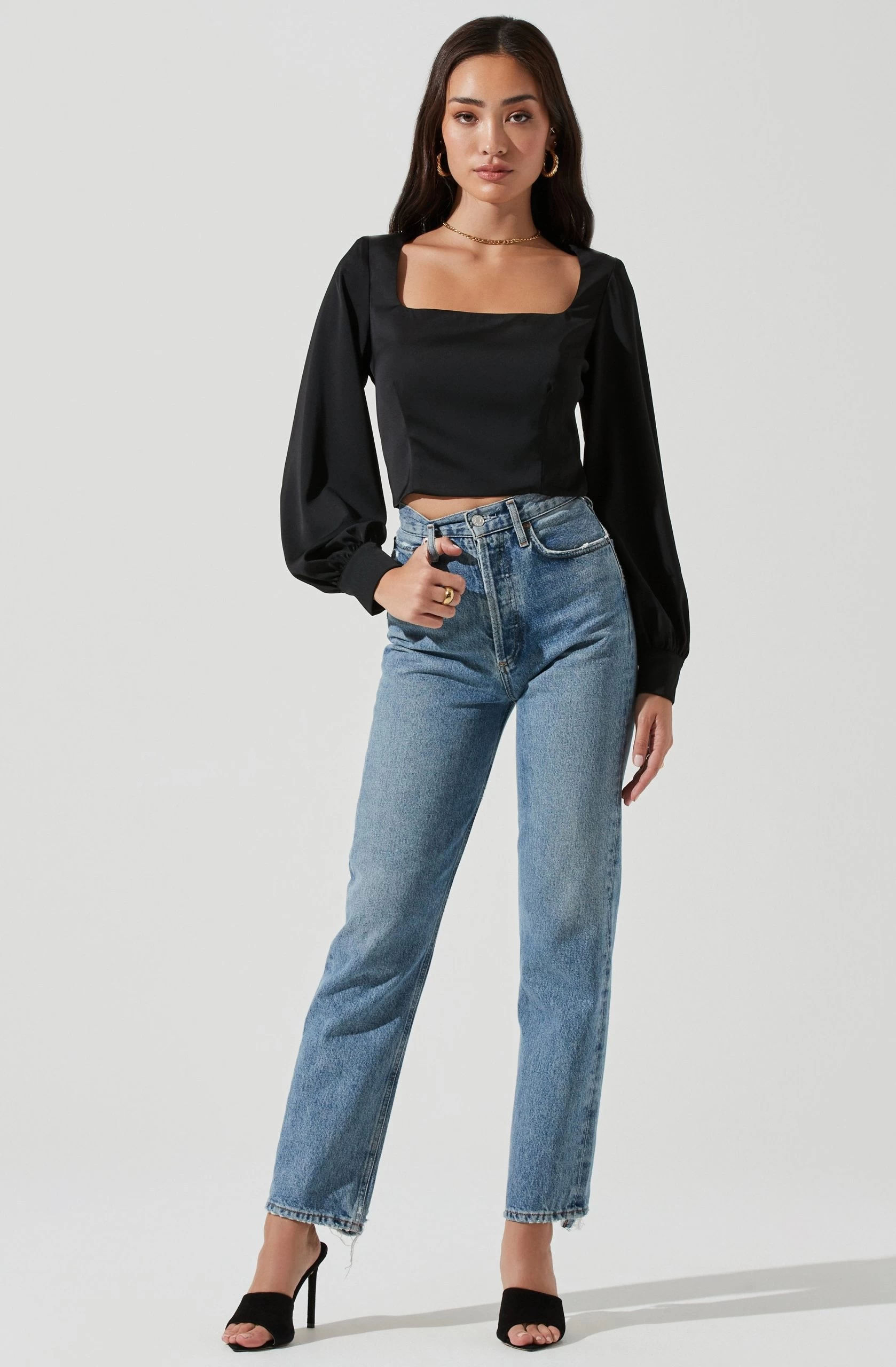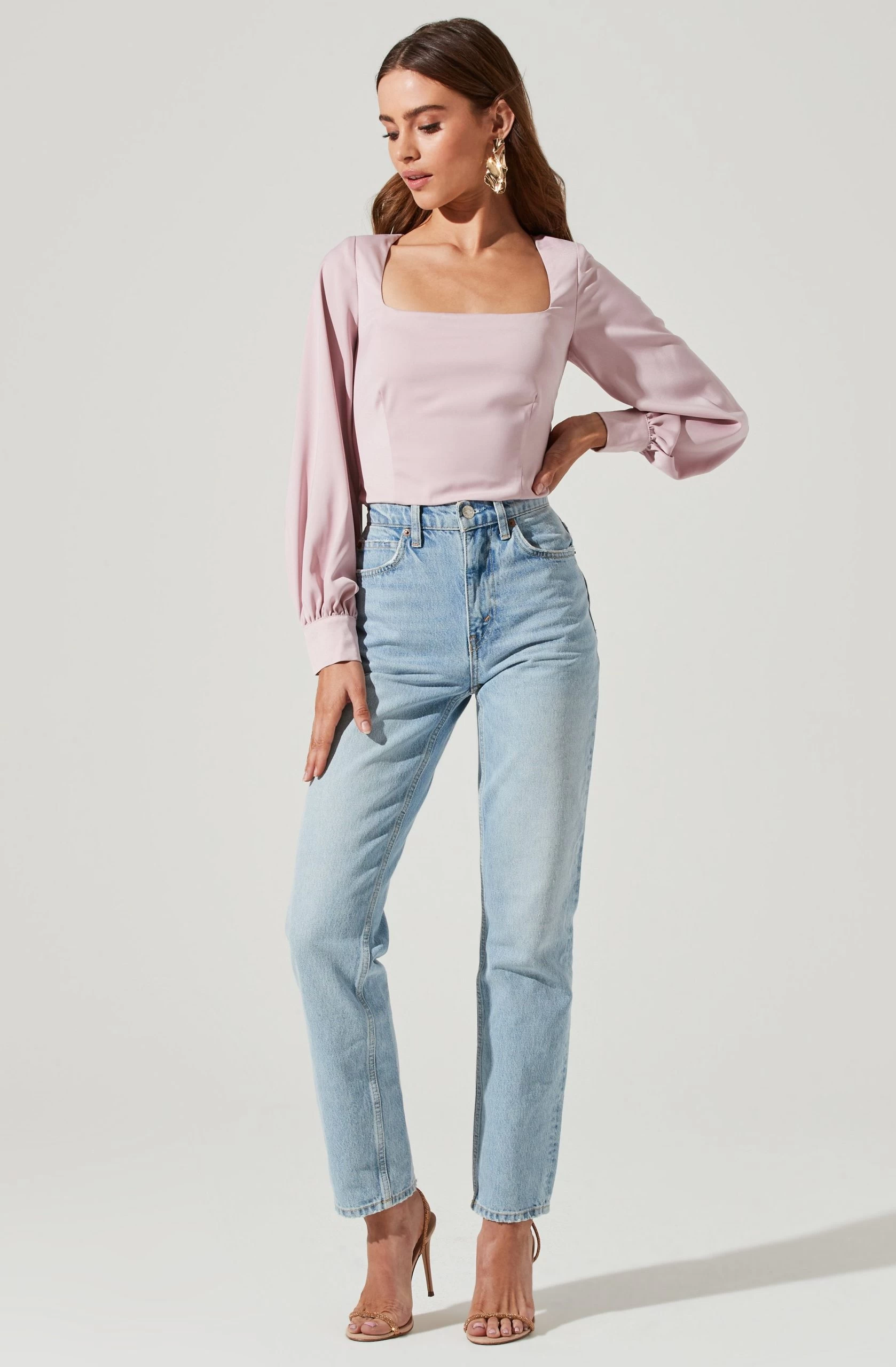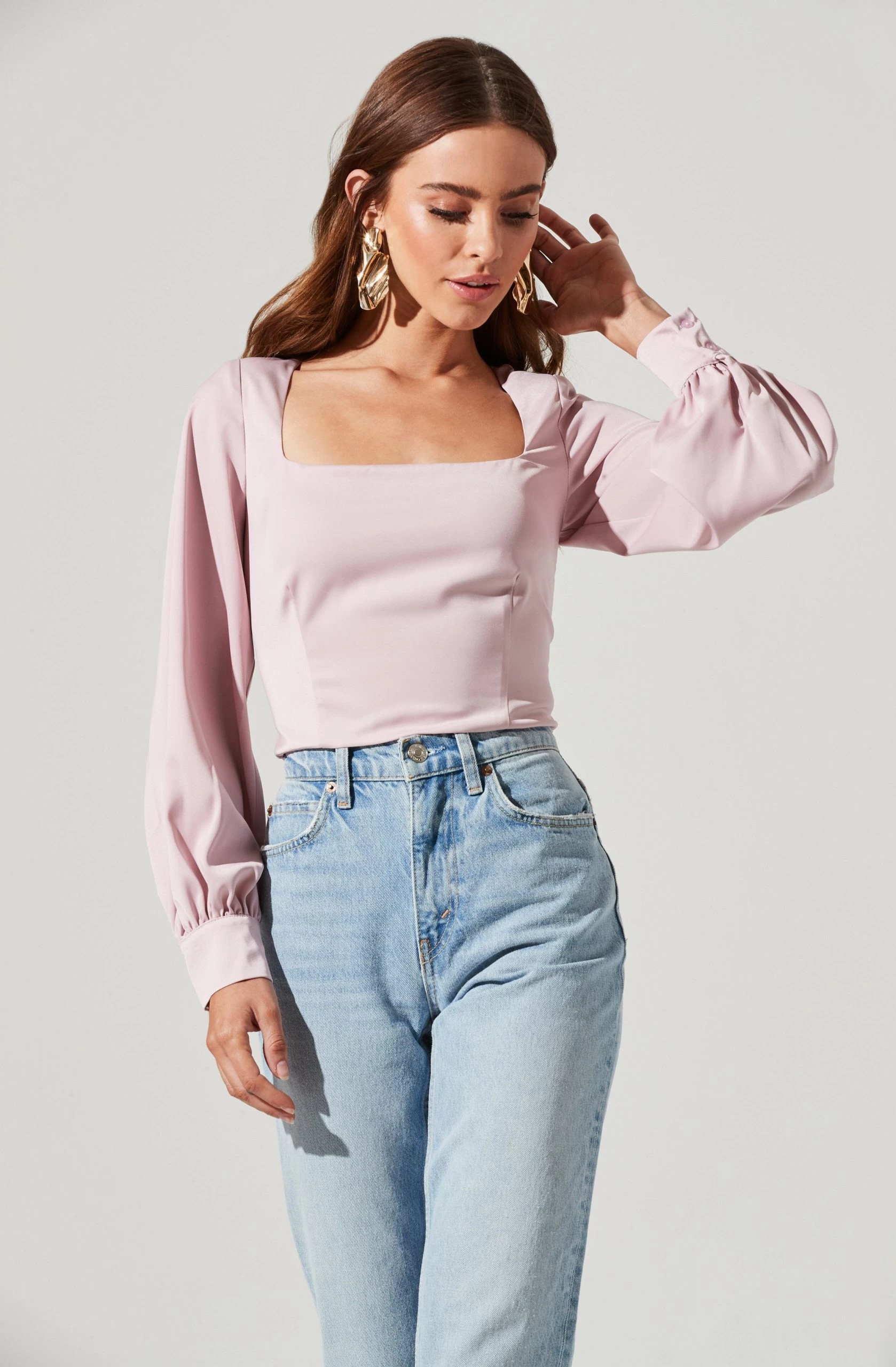 Sleek and ready for chic moments! This satin top features a square neckline that leads to a darted bodice. Long puff sleeves.