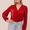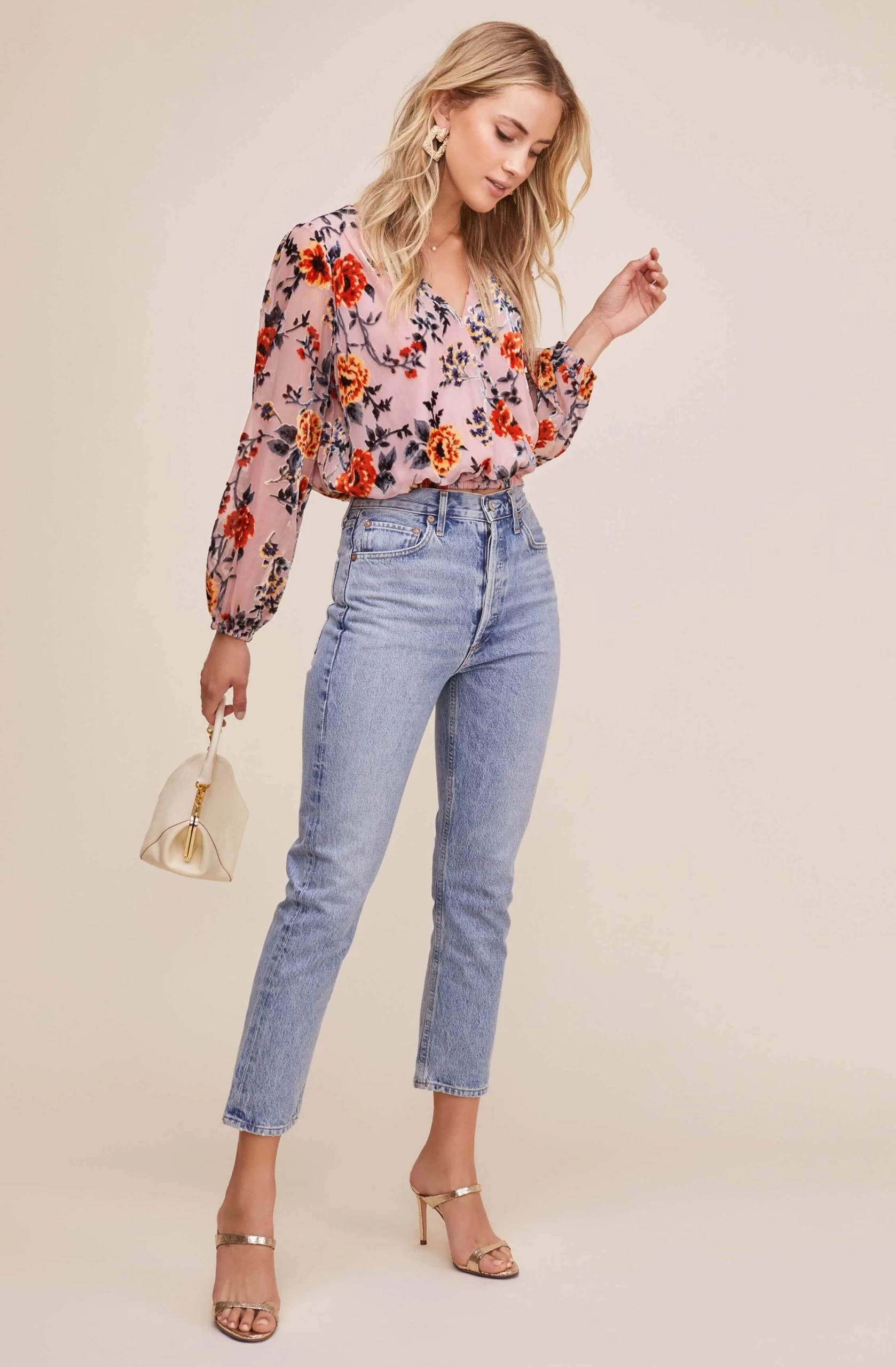 Fall calls for velvet and we are here for it! This chic top features a plunging V-neckline that leads to a wrapped front and cinched waist. Long puff sleeves and ditzy floral print throughout.