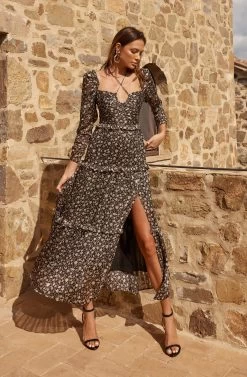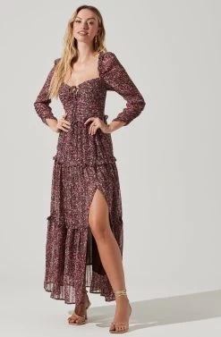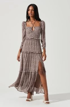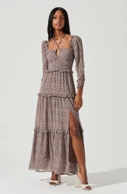 This special occasion dress features a moody floral print. Halter neckline leads to a cutout bust and smocked bodice. Tiered ruffle trim accents along the waist and skirt. Side slit accent. Long sleeves with ruching and voluminous shoulders. Low cut back. Lined.