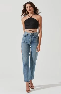 This linen-blend crop top features a halter neckline that leads to a darted bust and tie waist accent.