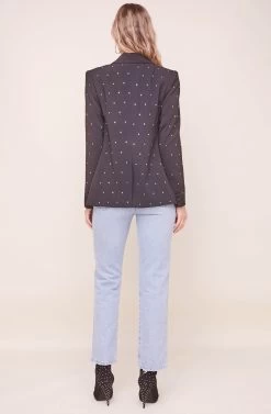 The Maeve Blazer is a statement party piece! It features a notched lapel, single button closure and sparkling jewel embellishment. Long sleeves. Side flap pockets. Vented back.
