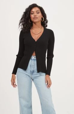 The Maida Sweater features a chic ribbed knit construction with a V neckline that leads to a front button placket. Long sleeves.