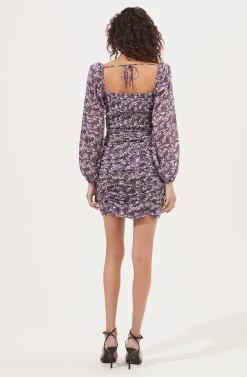 This floral dress features sweetheart neckline with a lace trim. Cupped bust leads to a ruched bodycon silhouette with drawstring accents at the hem. Long puff sleeves. Smocked back with self-tie straps.