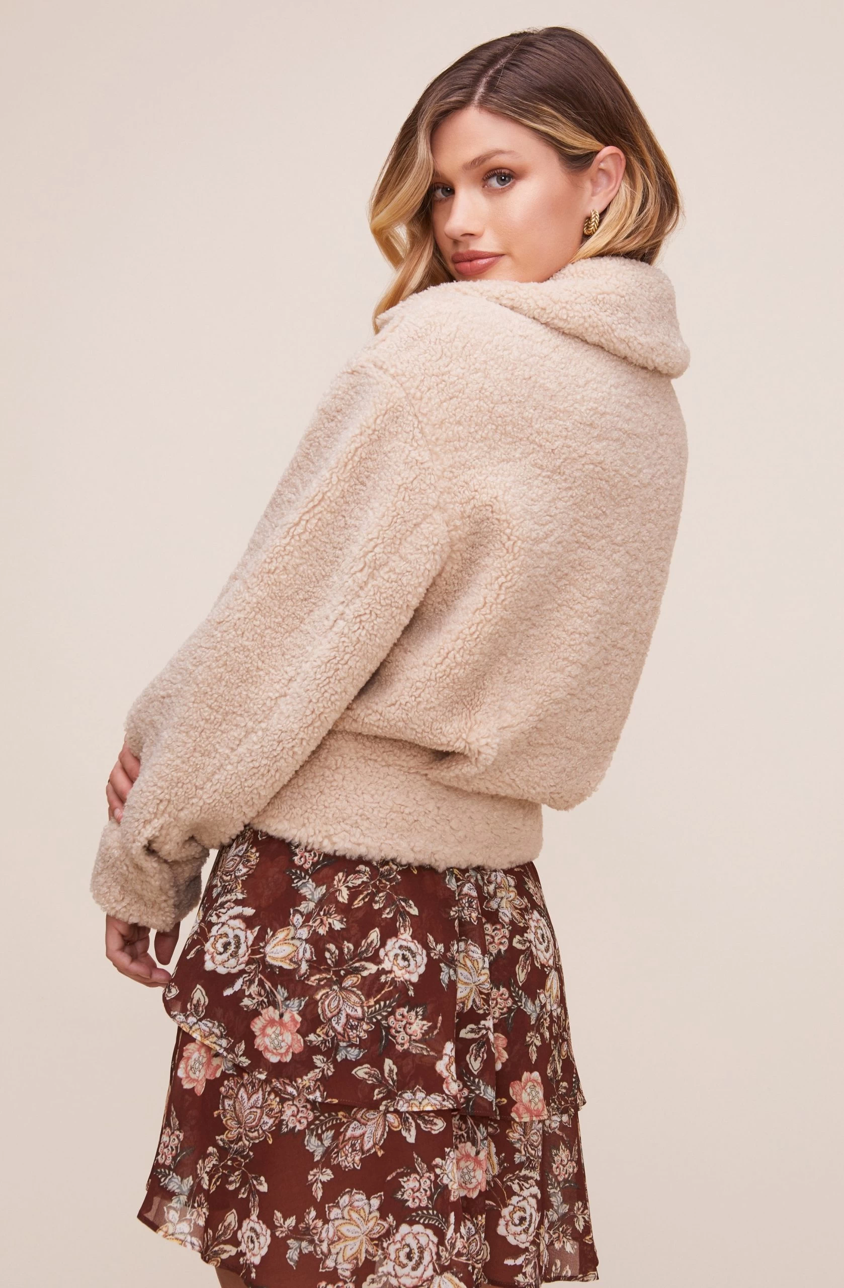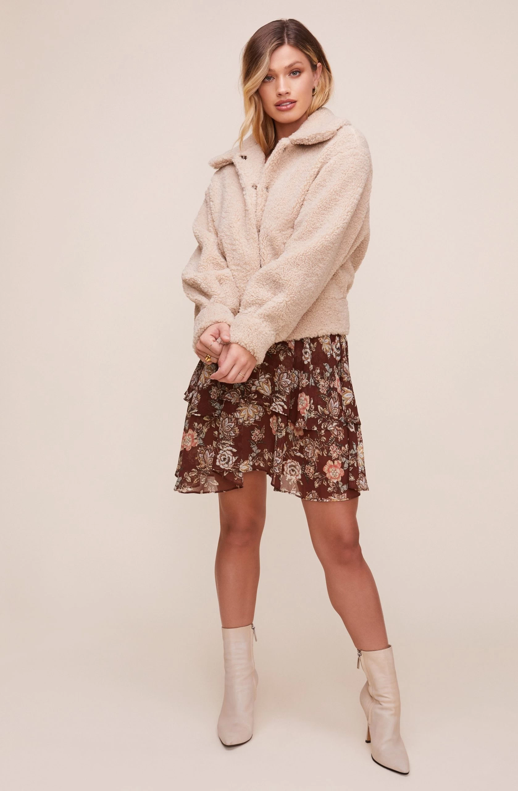 A statement jacket is all you need. The Marjorie Jacket features a an all-over shearling construction. Pointed collar descends to a buttoned front and slanted pockets at the front. Long sleeves.
