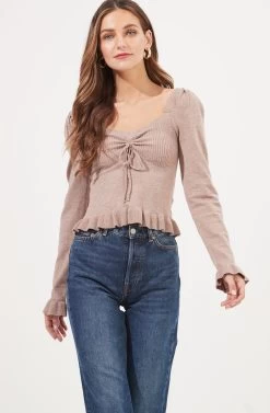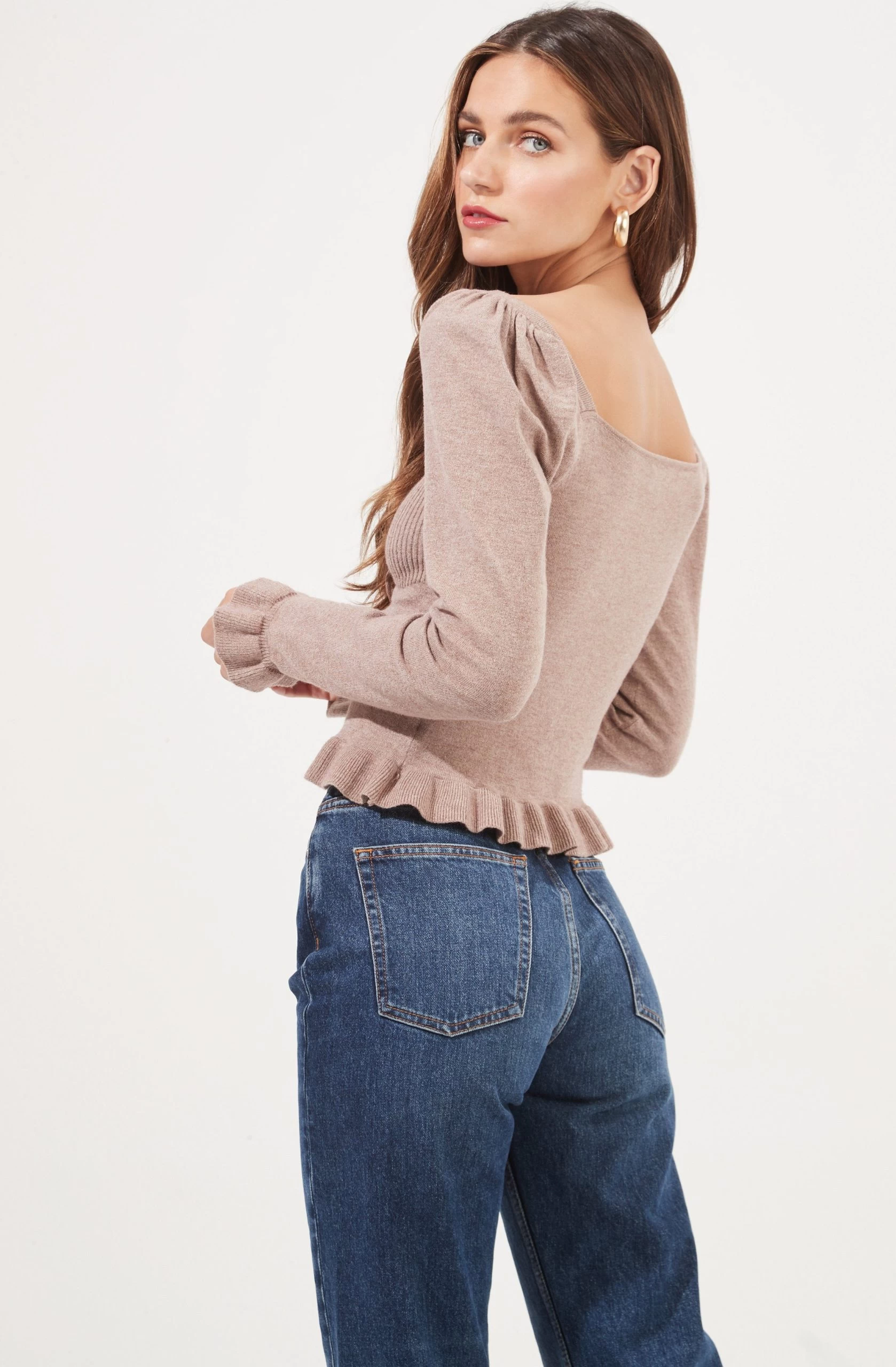 The Mattie Sweater features a sweetheart neckline with a cinched bust and drawstring accent. Long sleeves with ruffle cuffs and trim along the hem.