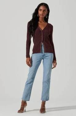 This knit cardigan features a metallic finish. V neckline leads to a buttoned front. Long sleeves. Slight stretch.