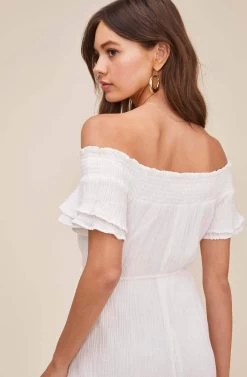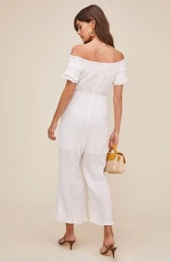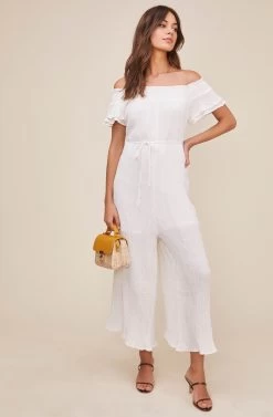 Perfect for those romantic strolls along the shore, the Maura Jumpsuit is a must! It features a relaxed, off-shoulder neckline leading to a cinched waist with a drawstring accent. Wide leg bottoms and short ruffle sleeves.