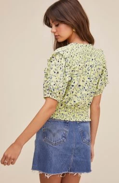It’s about to be a blooming summer! The Mavis Top features a deep V neckline that leads to a wrap front and smocked hem. Short ruffle sleeves and ditzy floral print throughout.