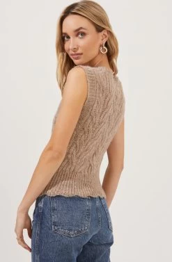 Say yes to prep! The Medina Vest features a V neckline that leads to a relaxed silhouette and scallop edge at the waist. Classic cable knit pattern throughout. Sleeveless.