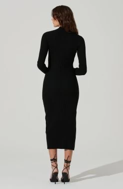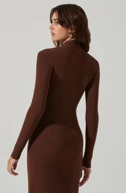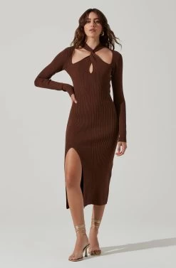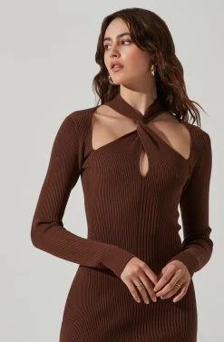 This ribbed knit sweater dress features a halter neckline with a twist front accent and keyhole detail. Long sleeves. Side slit accent.