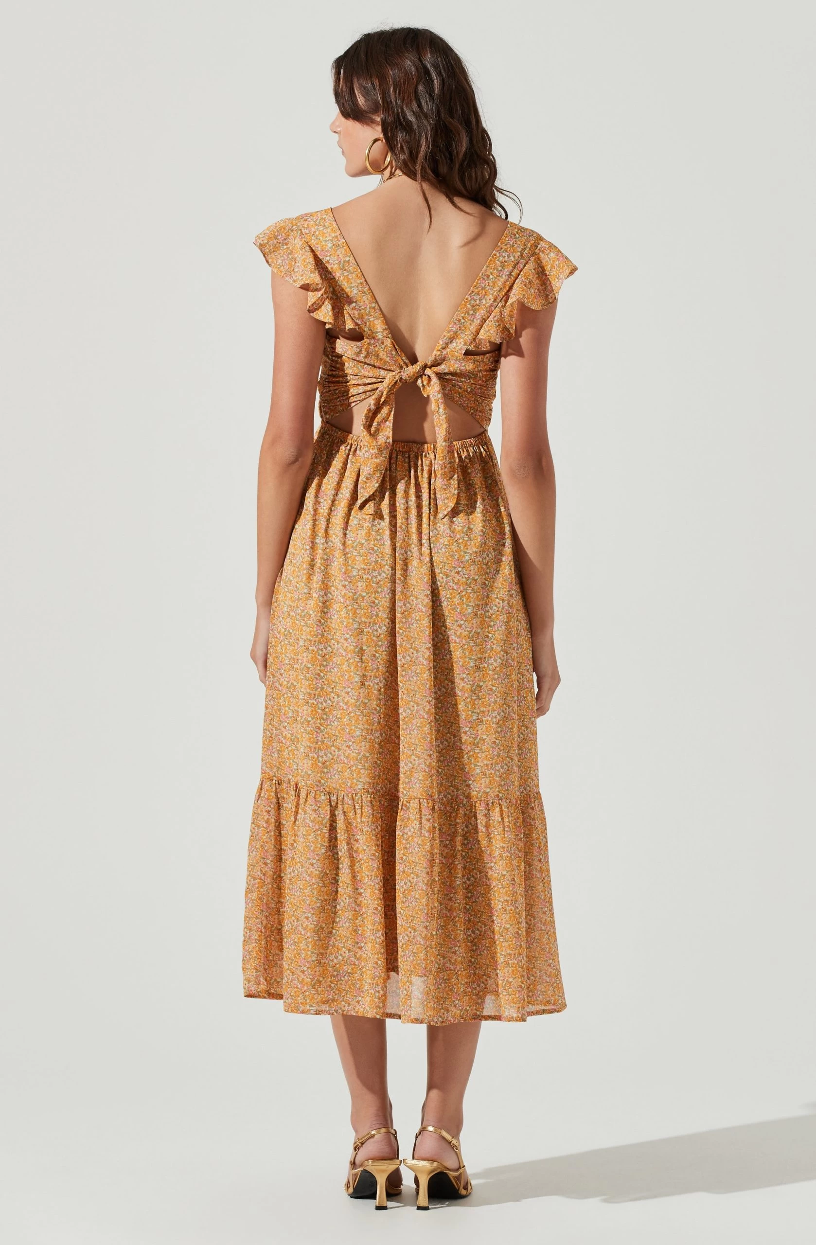 This romantic dress features a delicate floral print throughout. Plunge neckline leads to a front button placket and smocked waist. Cutout back and tying straps. Ruffle trim. Tiered midi length skirt.