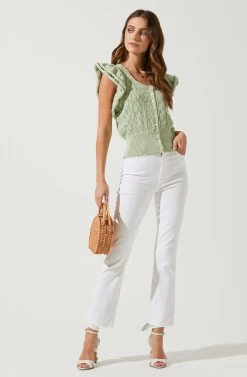 The Myla Cardigan features a scoop neckline with a pointelle knit design. Buttoned front. Short ruffle sleeves.