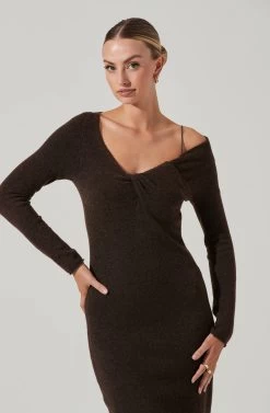 The Naya Dress features a soft sweater knit finish. Asymmetrical neckline features a supportive strap accent. Twist accent at the bust. Bodycon silhouette. Long sleeves. Midi length.
