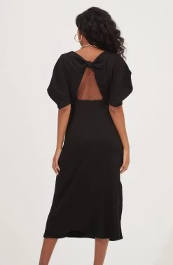 This chic dress features a plunge neckline with a front cutout accent. Short puff sleeves and open back. Midi-length skirt with a side slit accent.