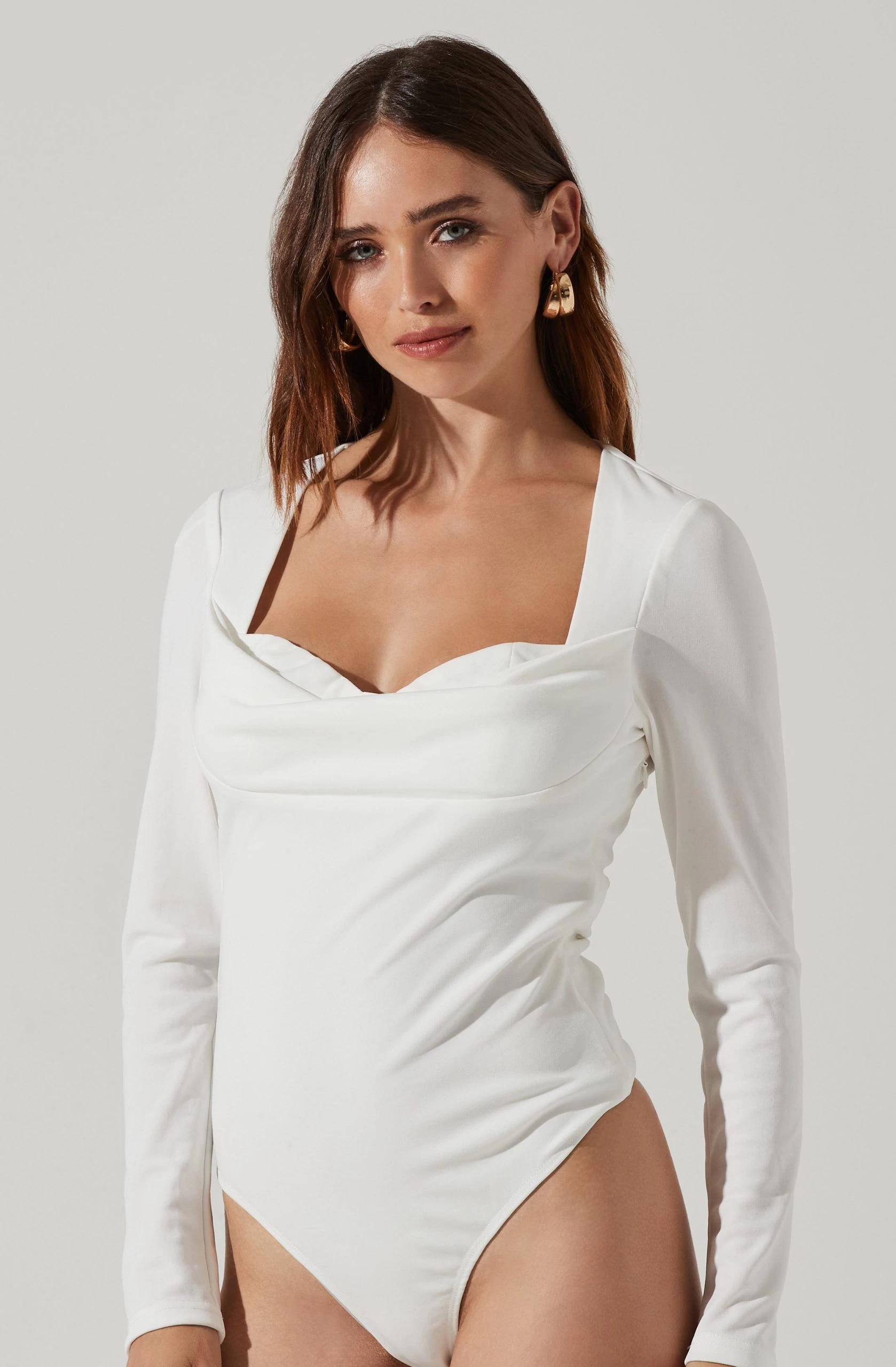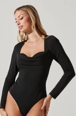 The Nyra bodysuit features a sweetheart neckline and long sleeves. Attached thong bottoms have snap button closures.